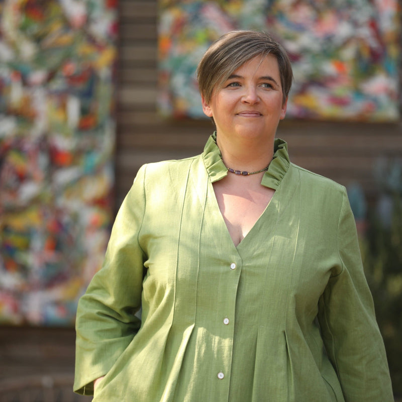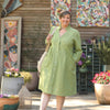 Dotée de manches 3/4, elle présente une série de plis piqués qui dessinent subtilement la taille tout en offrant une belle ampleur à la jupe.