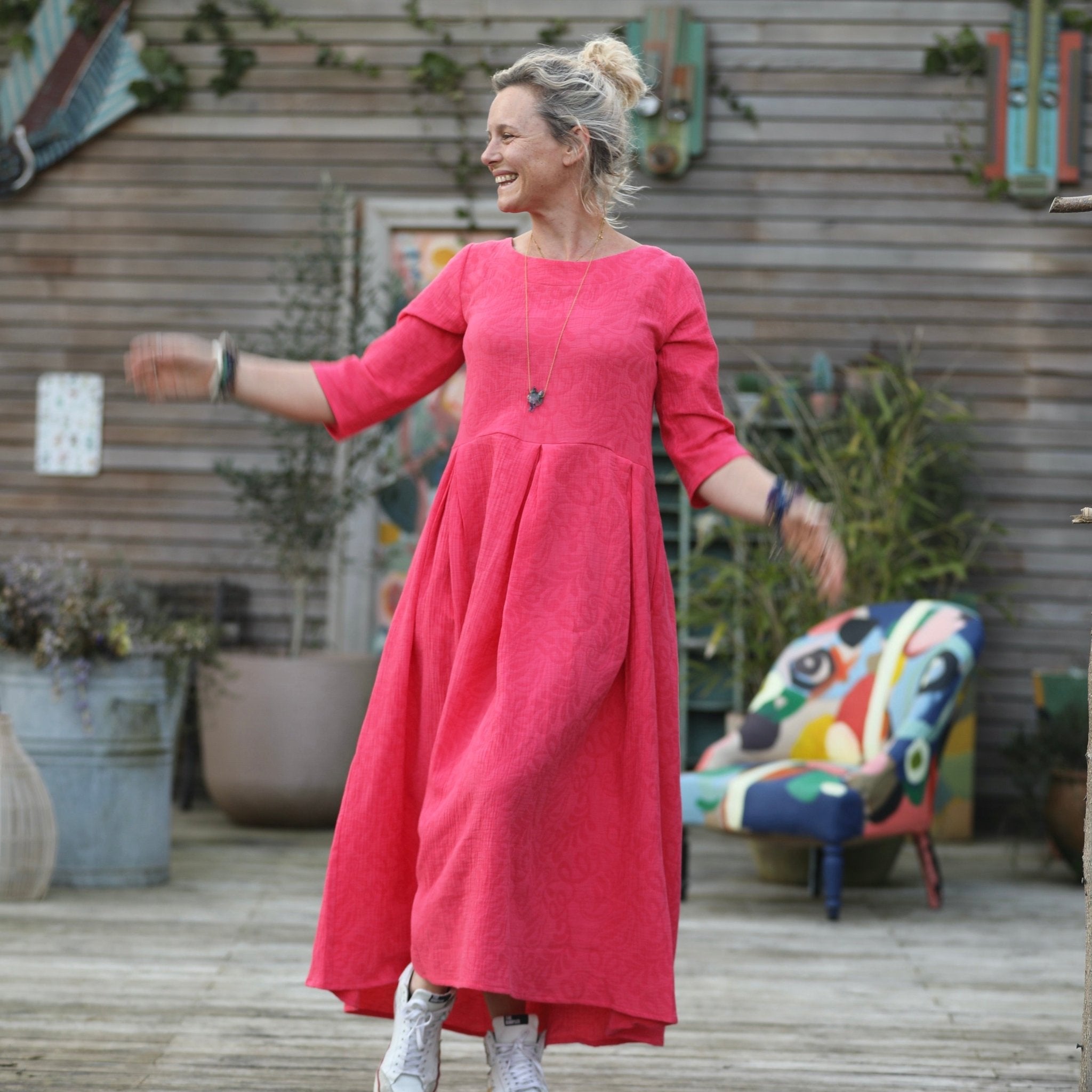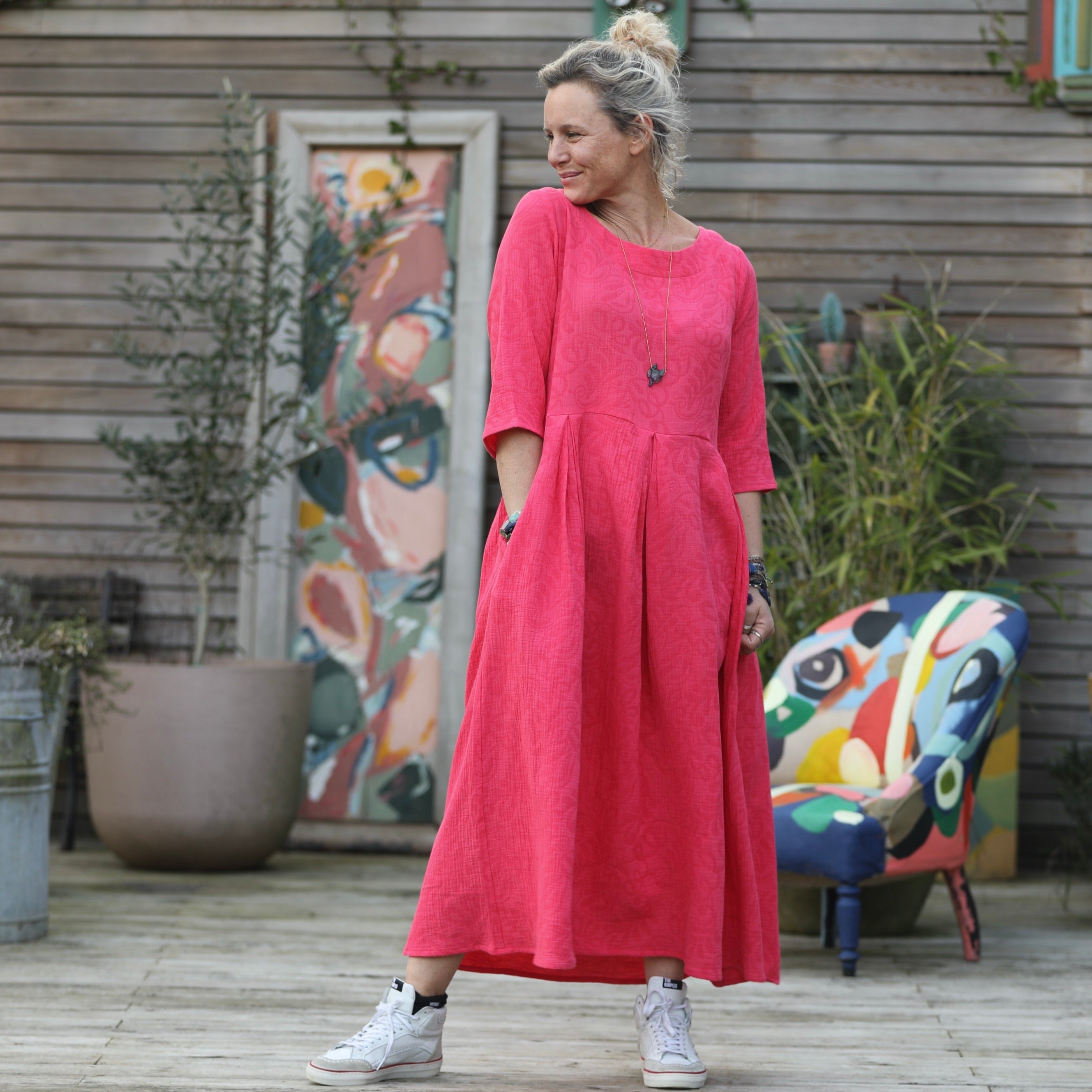Robe Louisa manches 3/4 jacquard coton/lin fuchsia