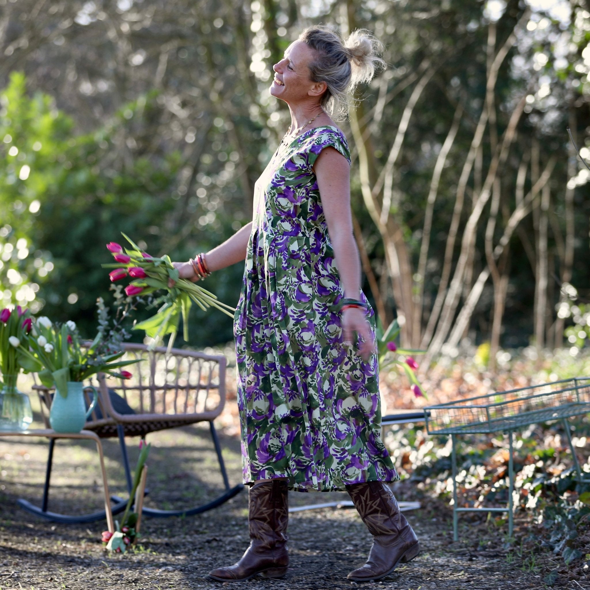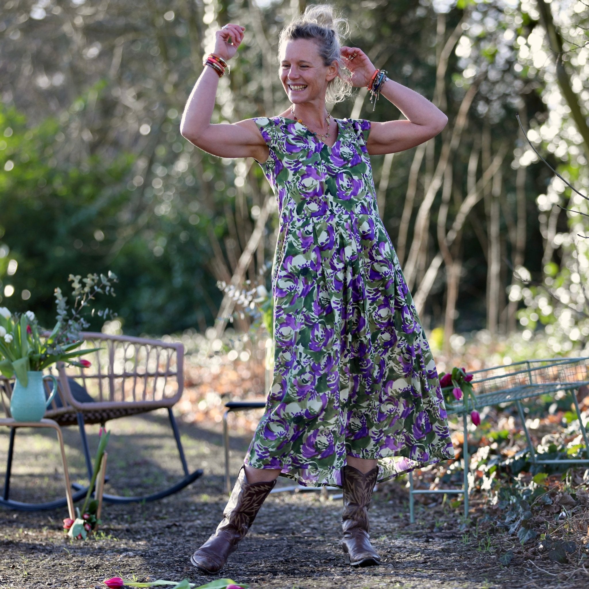 Confectionnée dans un satin de coton doux, léger et fluide, cette matière offre un tombé souple et une belle luminosité. L’imprimé Iris graphique est imprimé en France, dans la région lyonnaise, berceau du savoir-faire textile. Le motif mêle fraîcheur florale et modernité graphique, pour une robe lumineuse et pleine de personnalité.