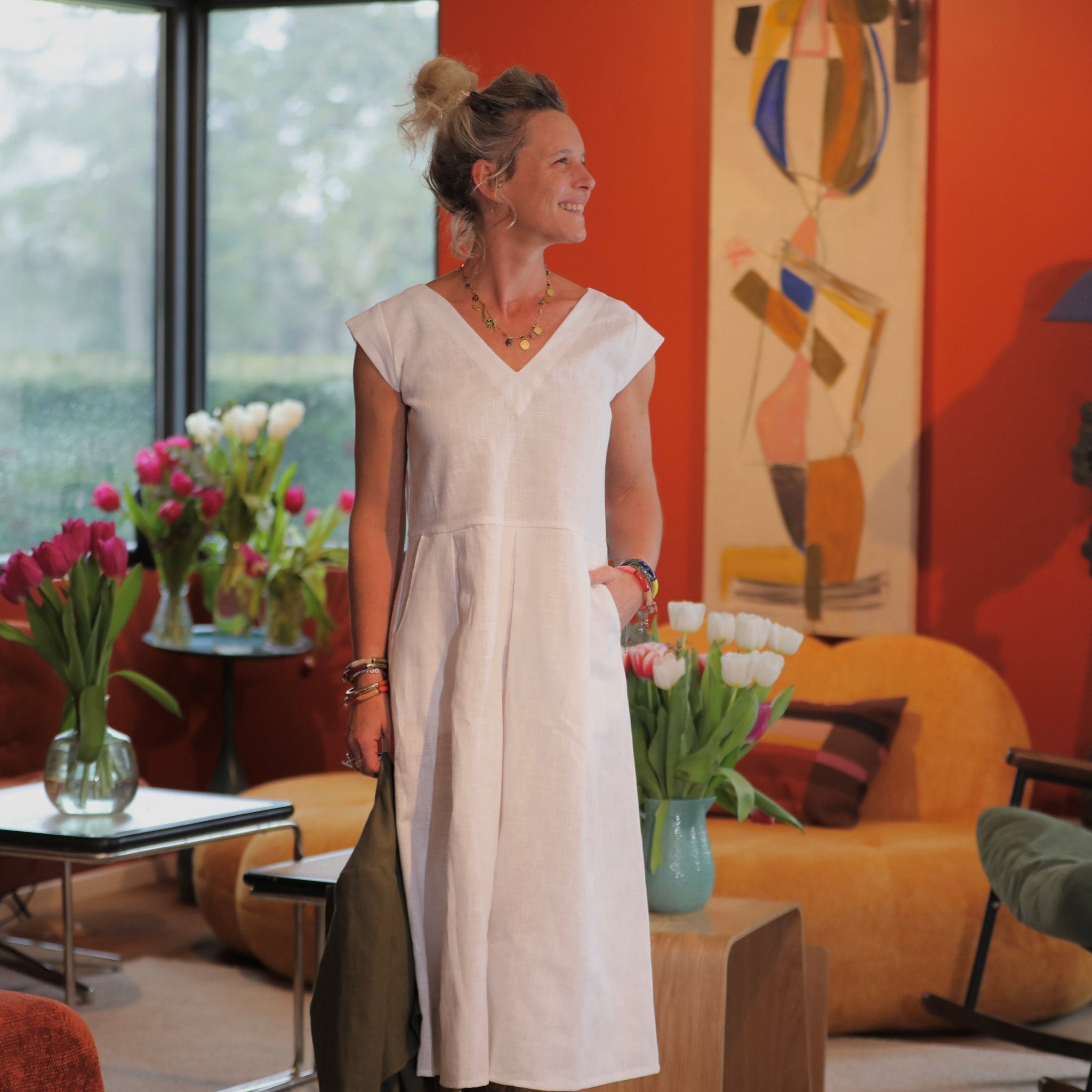 Confectionnée dans un lin naturel, respirant et souple, cette matière offre un tombé élégant et une belle tenue tout en restant agréable à porter. Le blanc lumineux met en valeur la pureté de la coupe et apporte fraîcheur, douceur et modernité à la silhouette.
