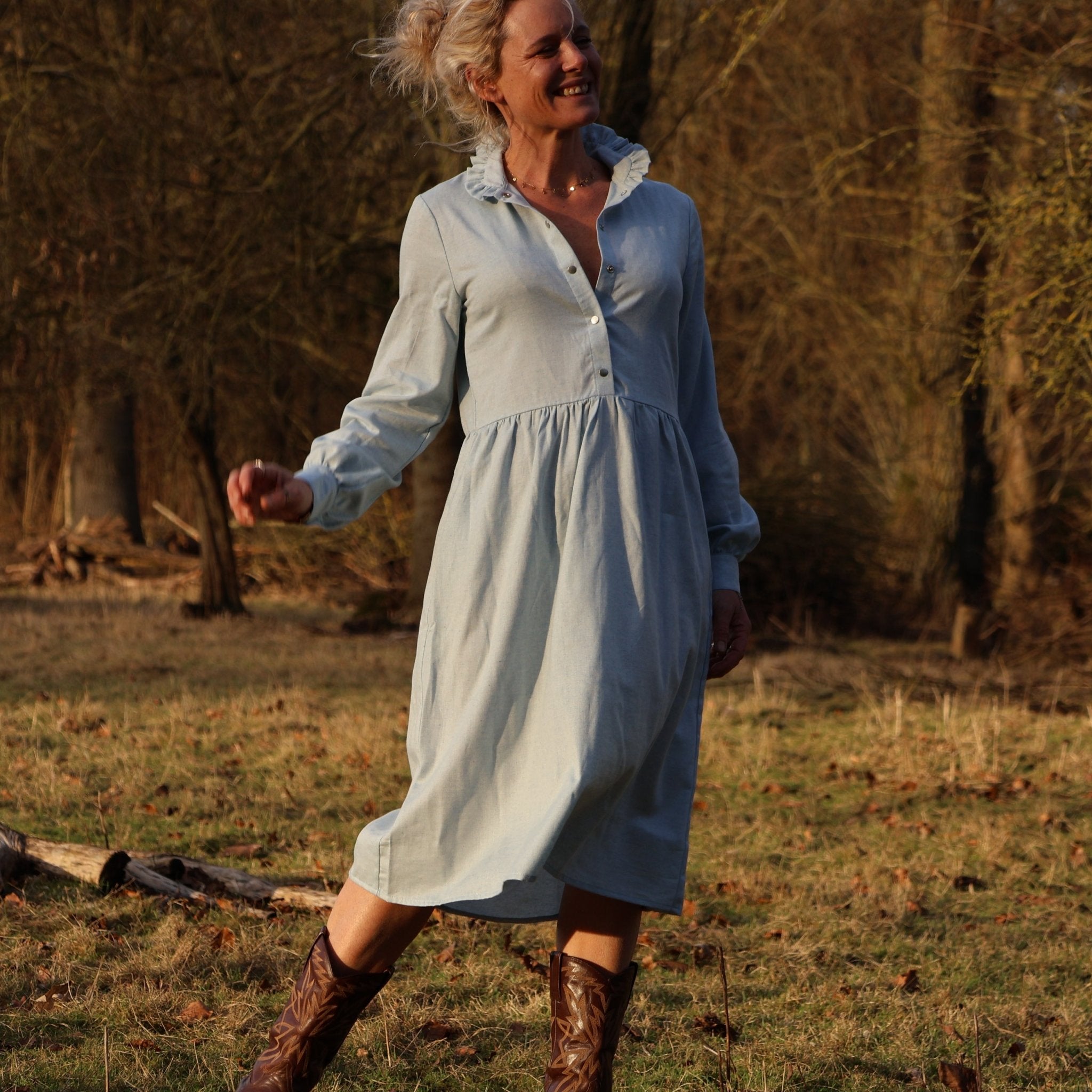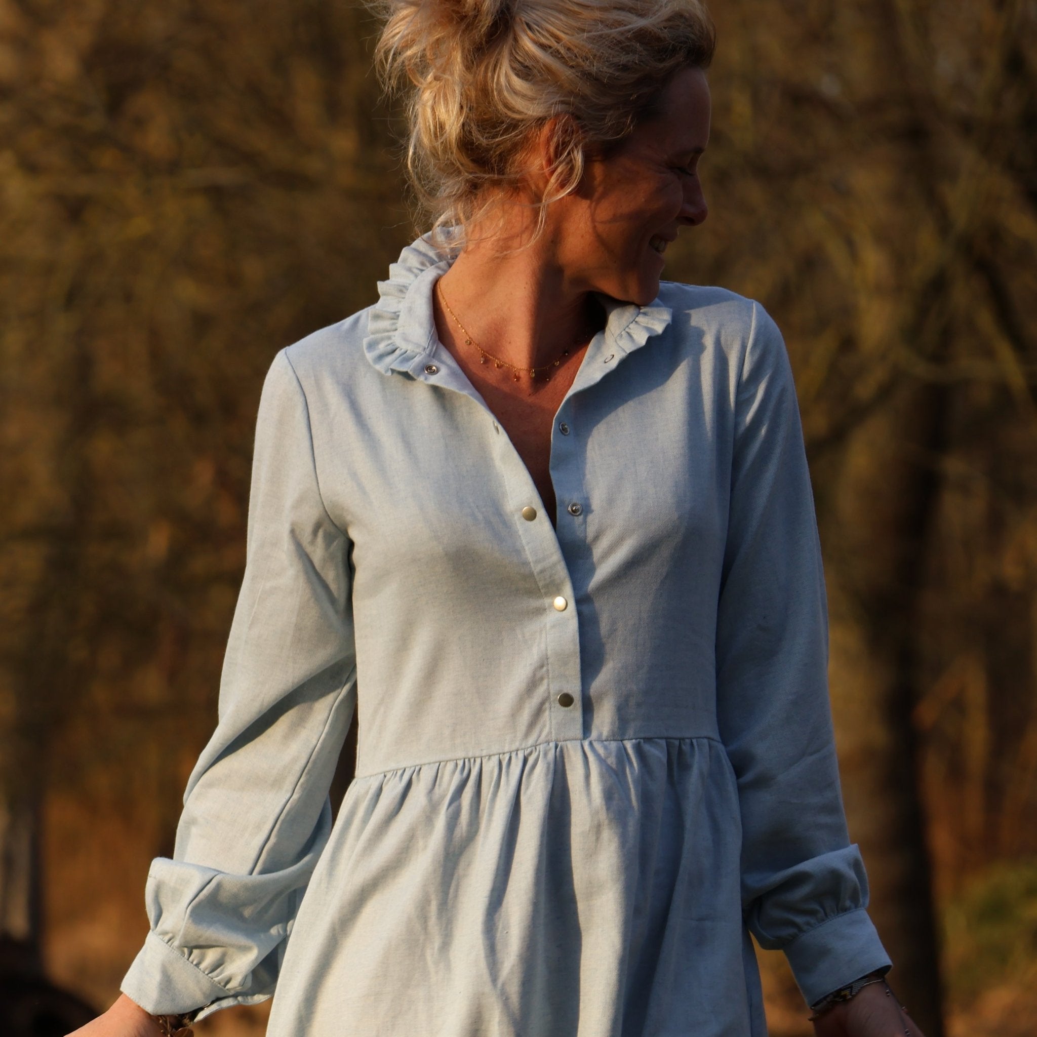 Pomme, la robe élégante avec son col froufrou, son décolleté ajustable, sa découpe taille haute, ses manches resserrées aux poignets par un joli bouton français et... ses poches tellement pratiques :-)
