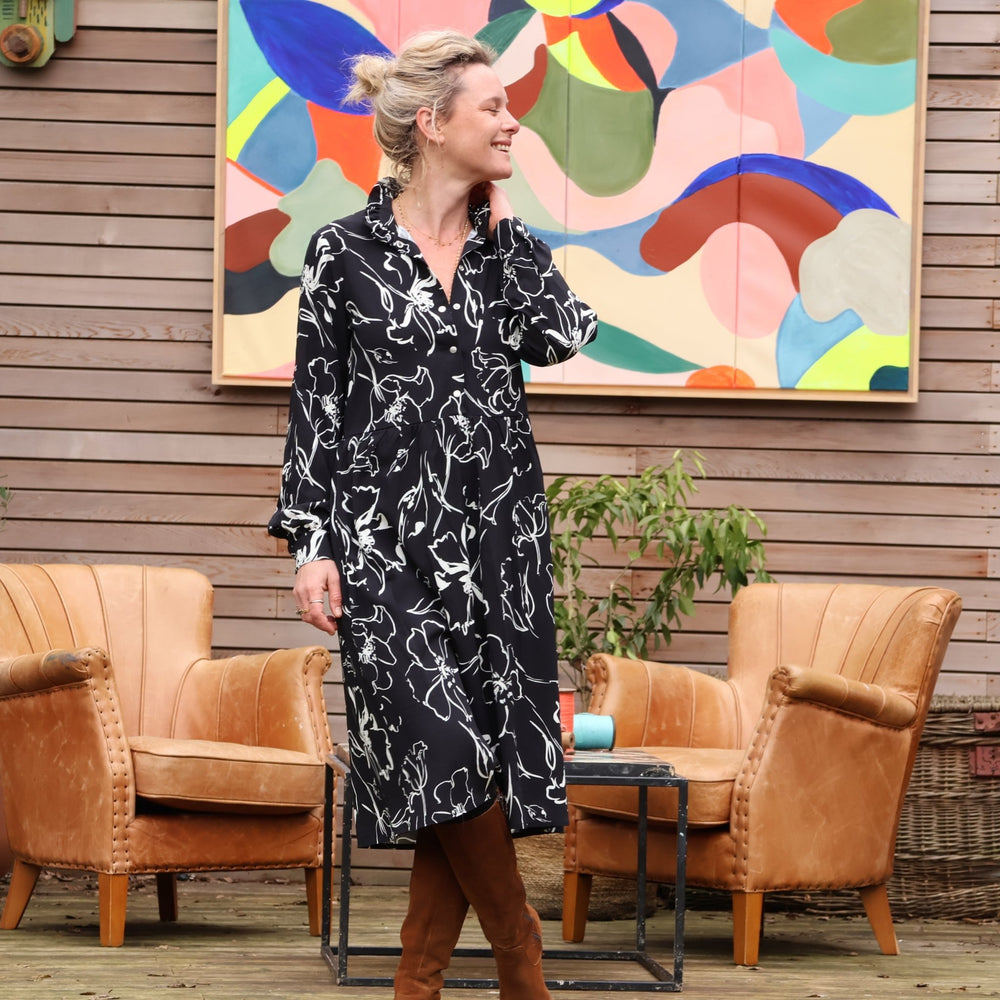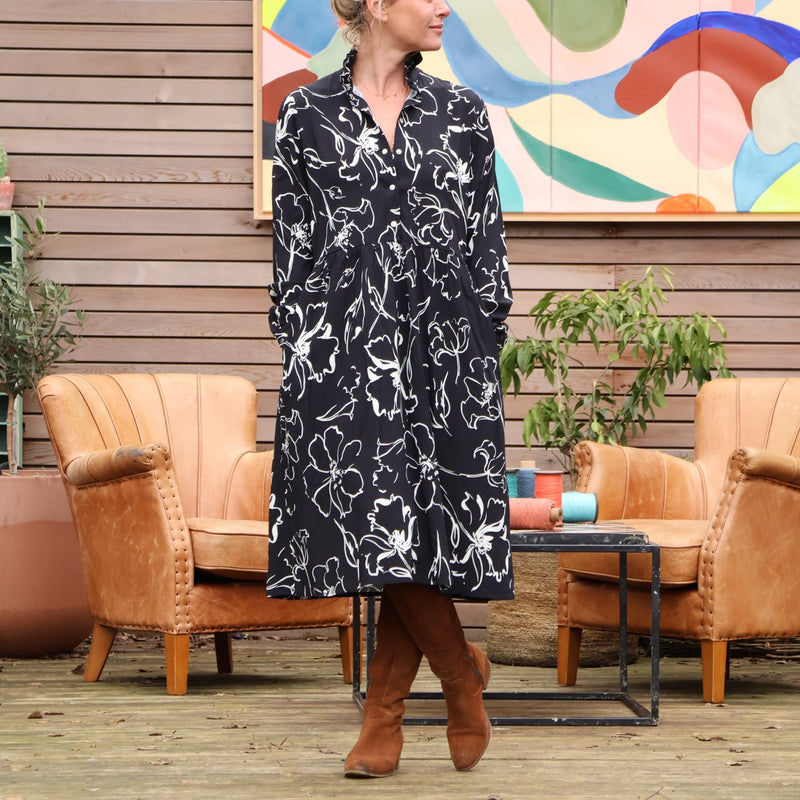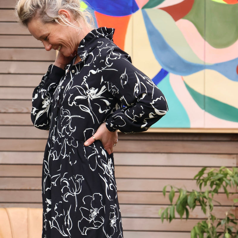 Pomme, la robe élégante avec son col froufrou, son décolleté ajustable, sa découpe taille haute, ses manches resserrées aux poignets par un joli bouton français et... ses poches tellement pratiques :-)