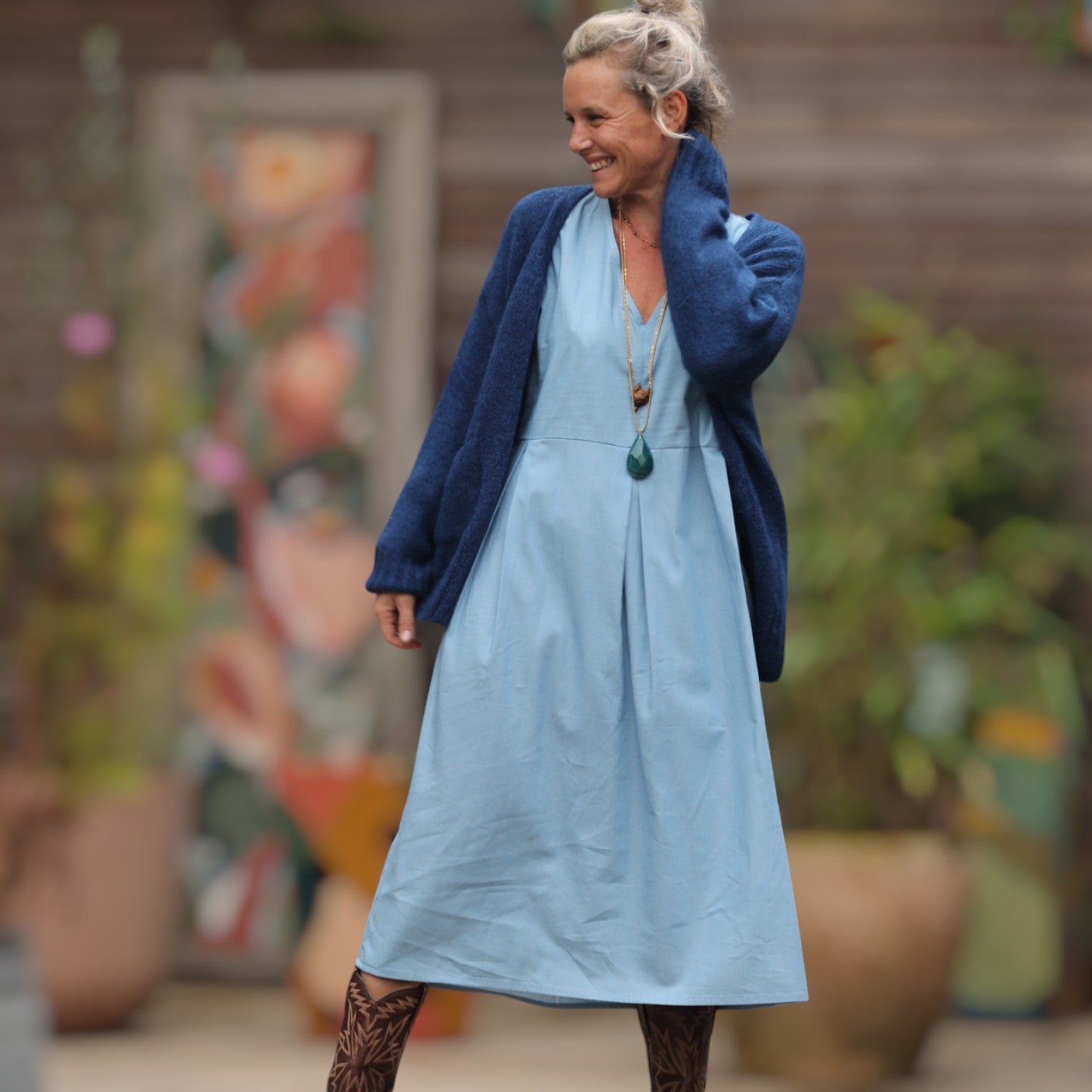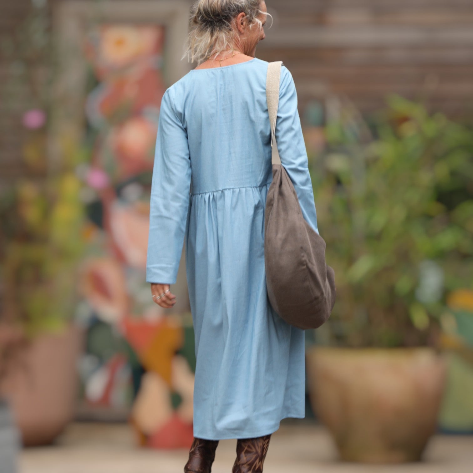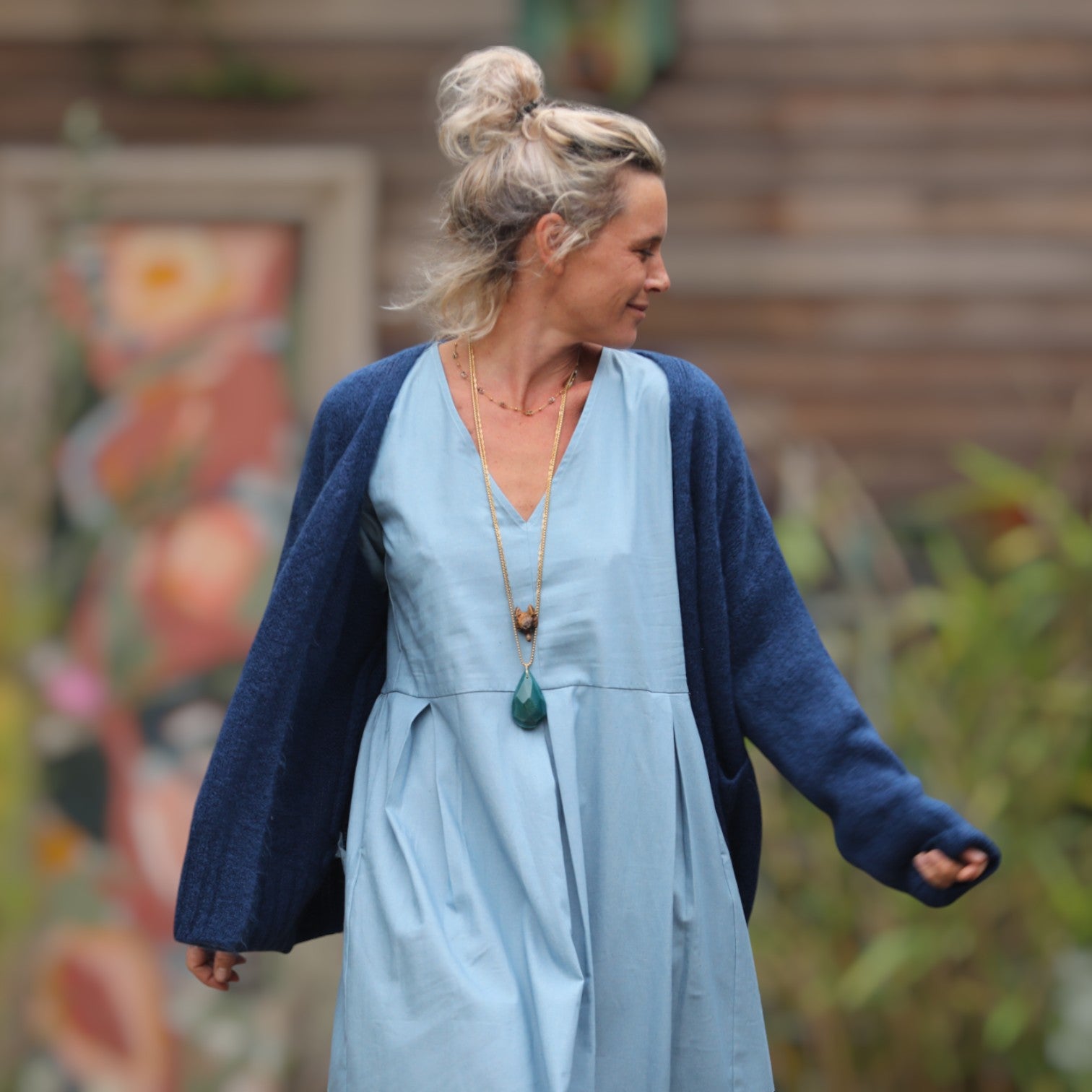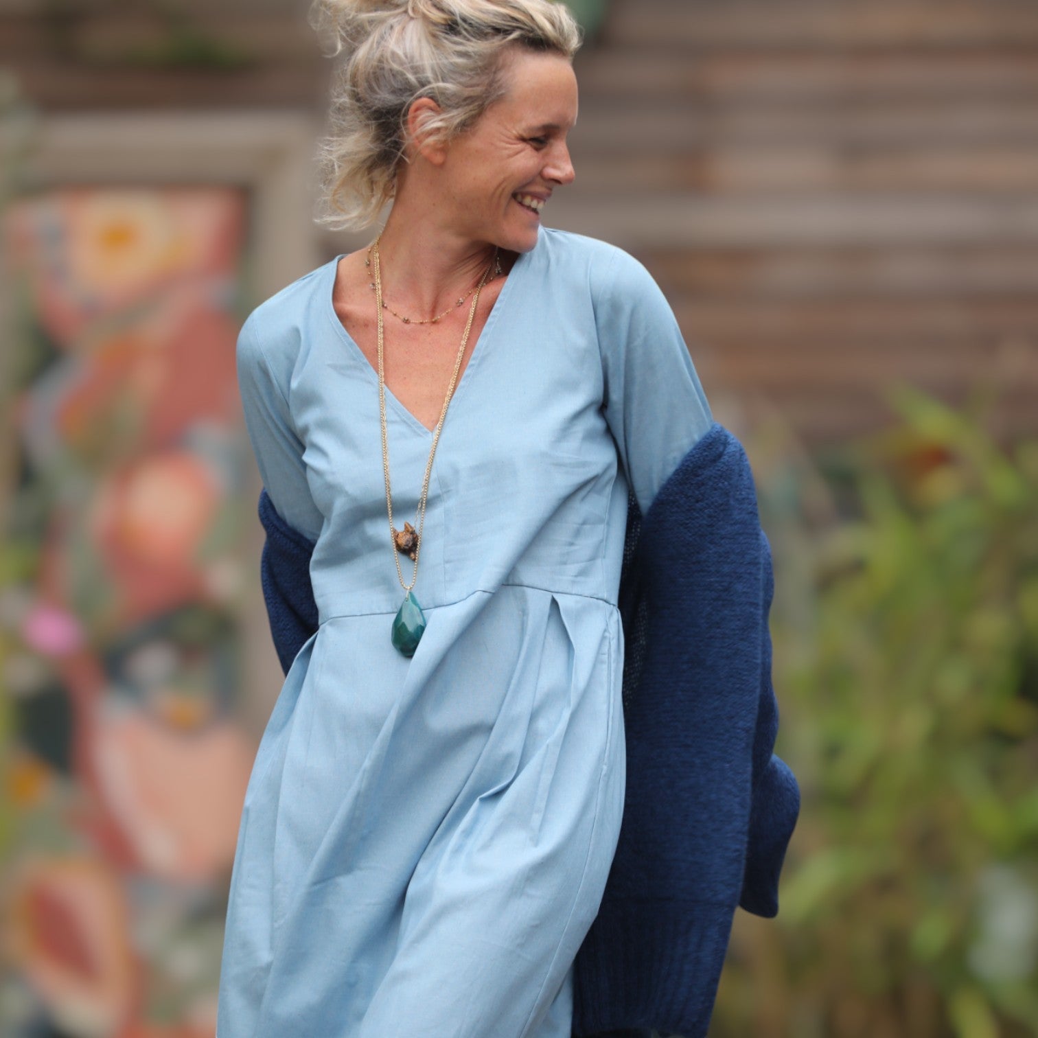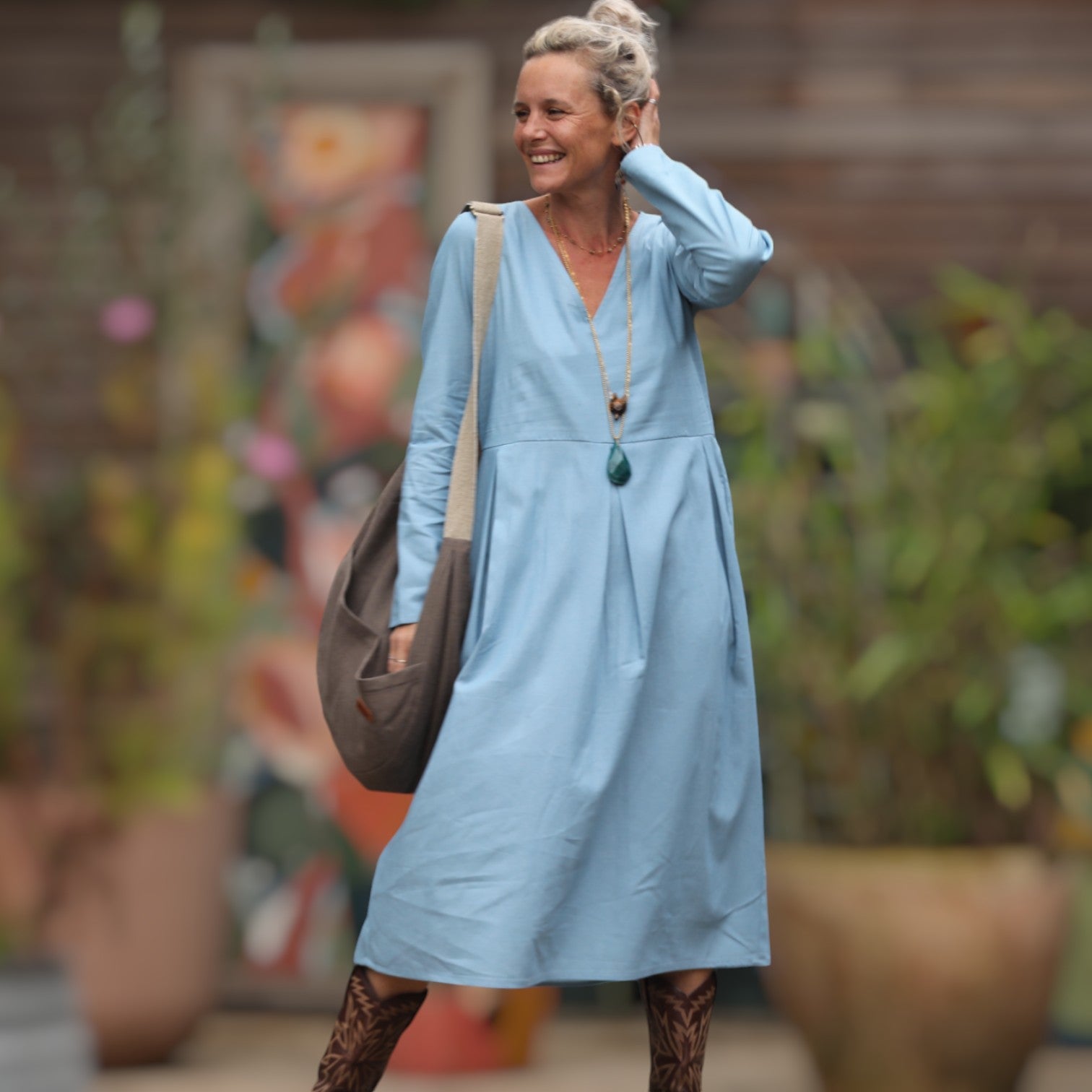 Voici Romane, une robe élégante avec un décolleté en V, de jolis plis raffinés, des manches longues, une découpe empire et une longueur midi.