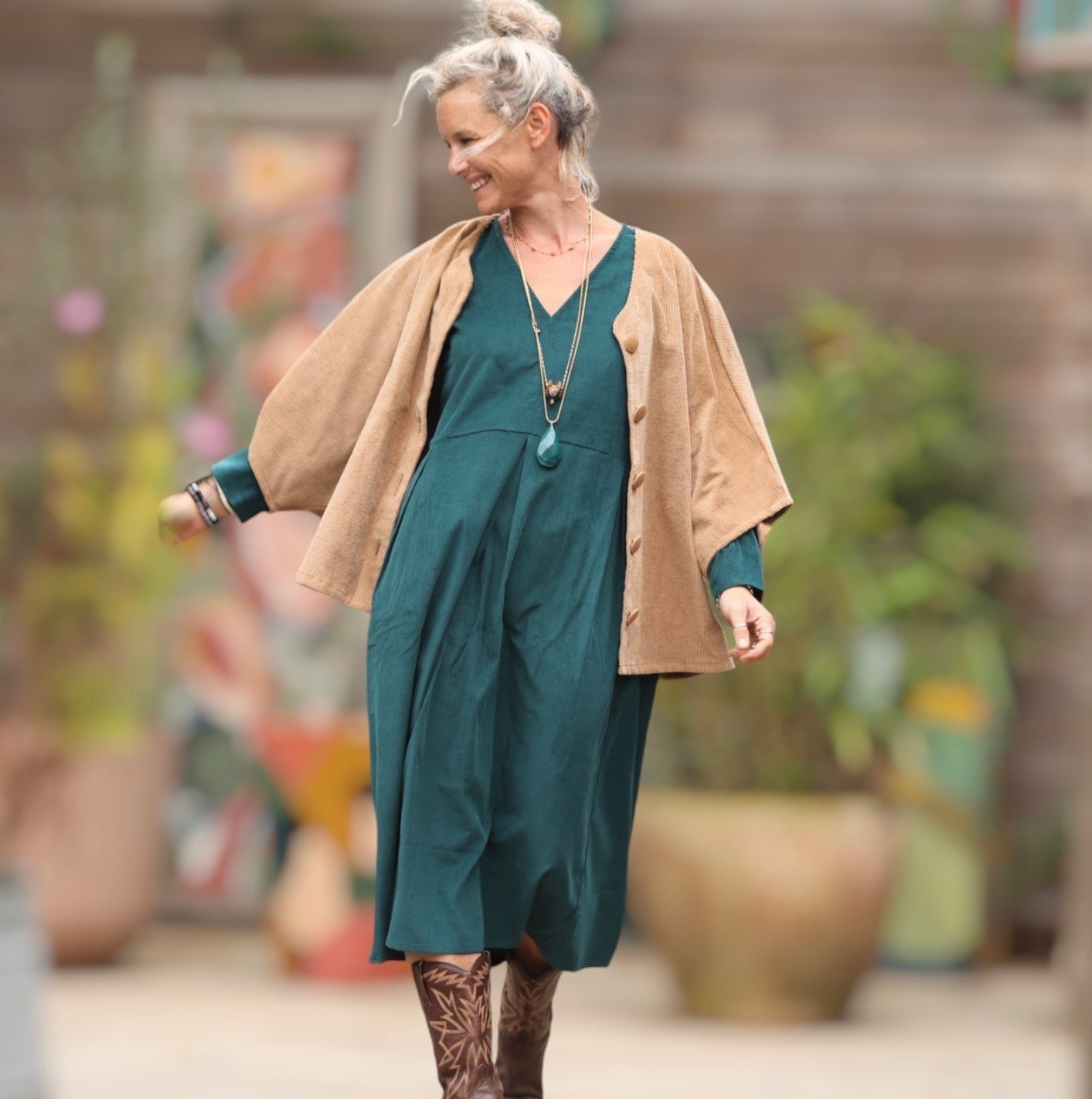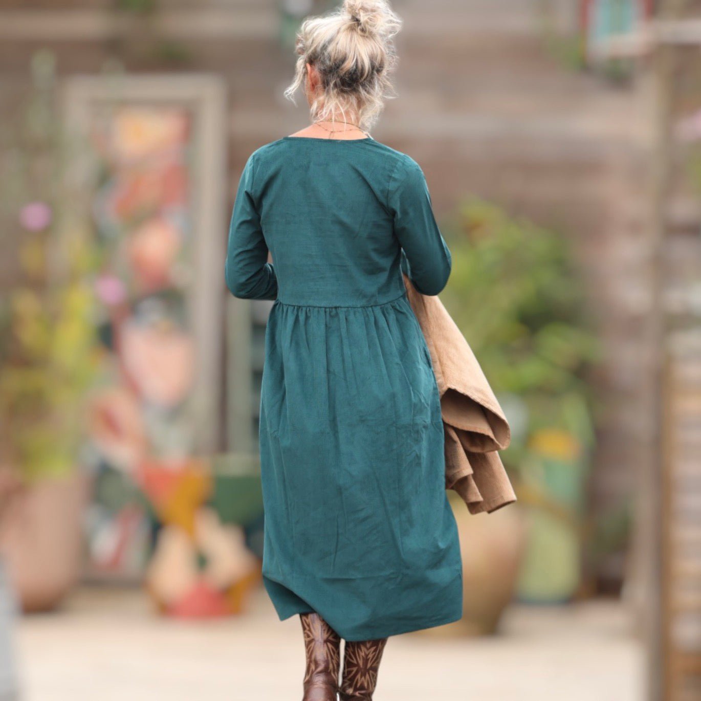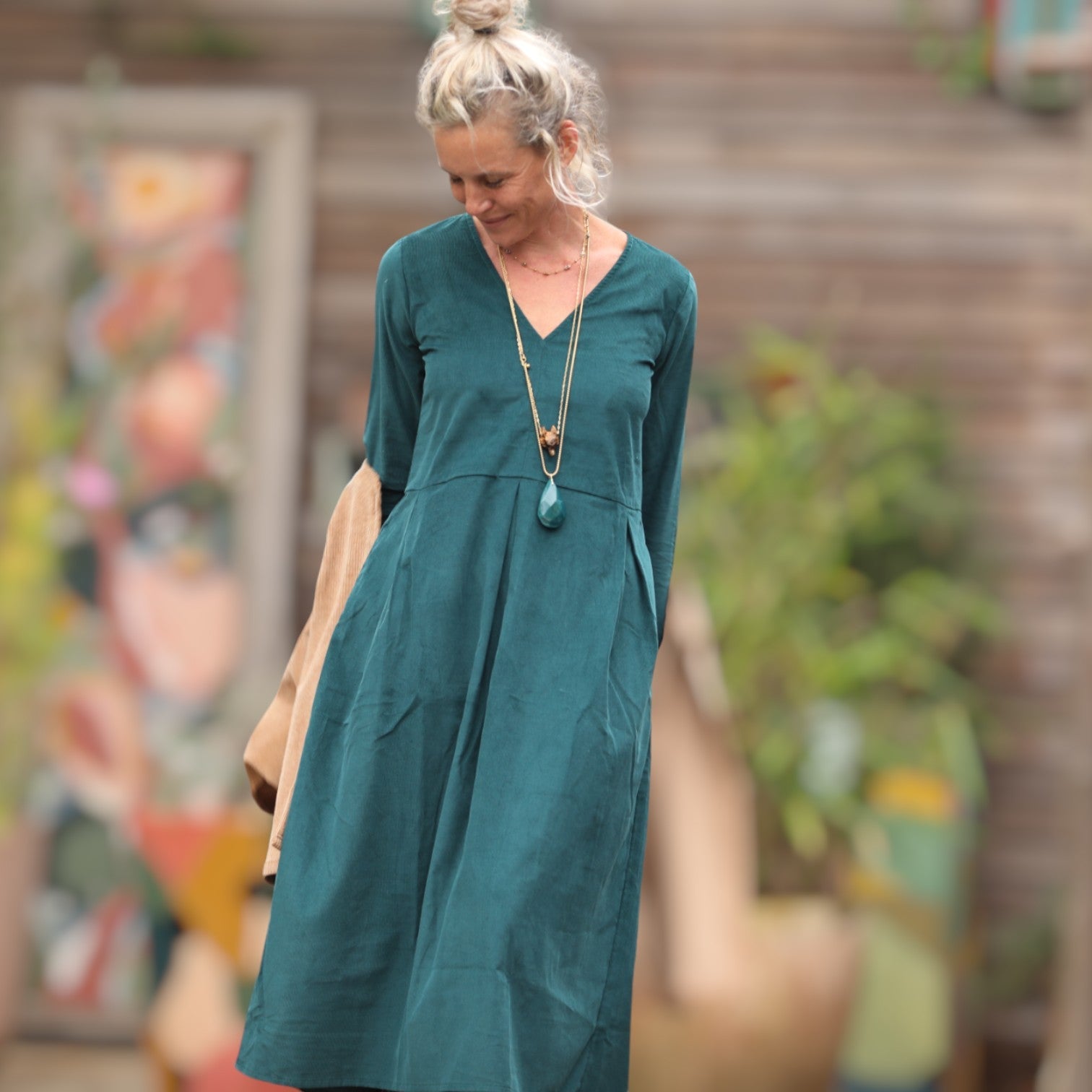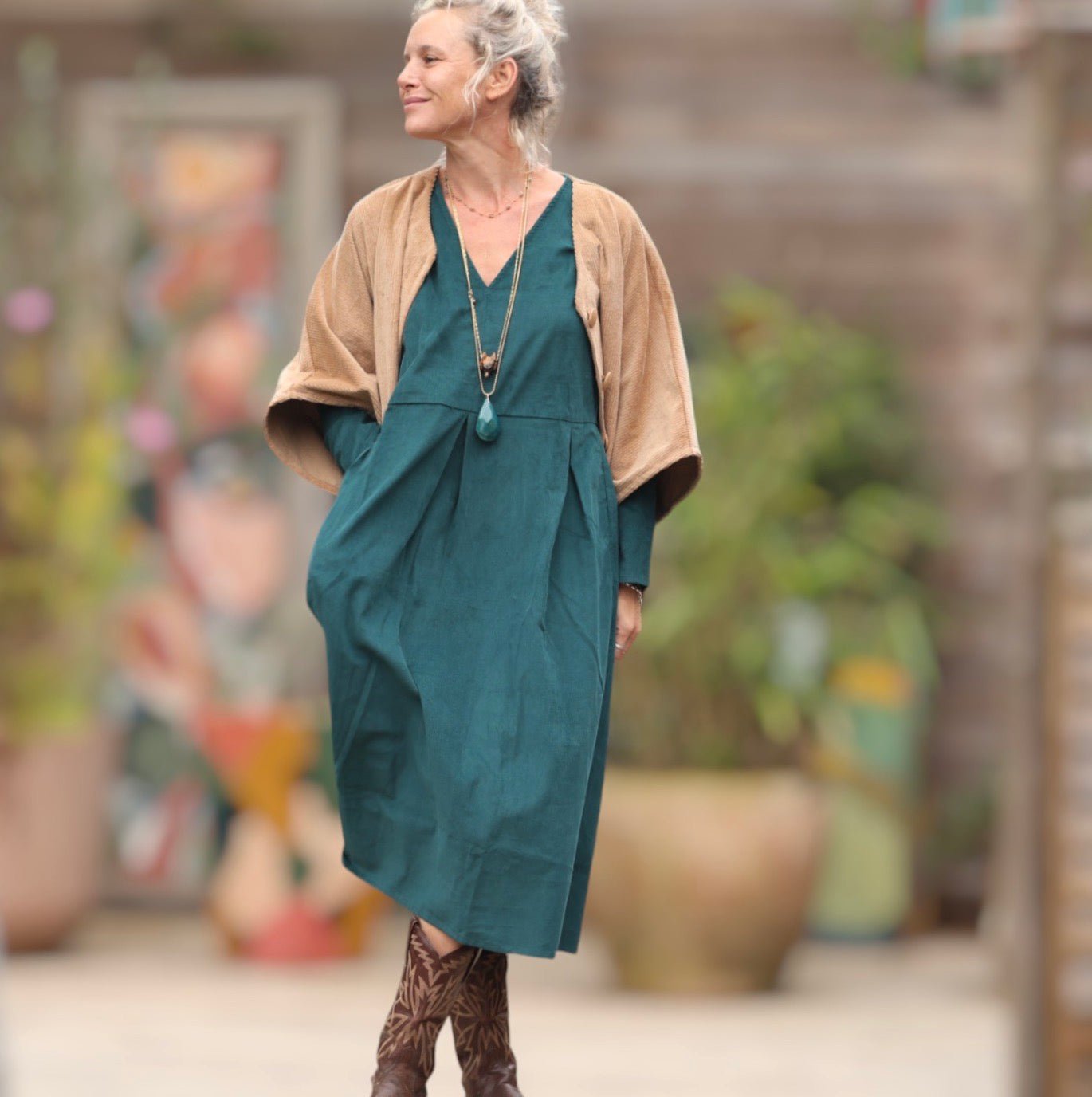 Voici Romane, une robe élégante avec un décolleté en V, de jolis plis raffinés, des manches longues, une découpe empire et une longueur midi.