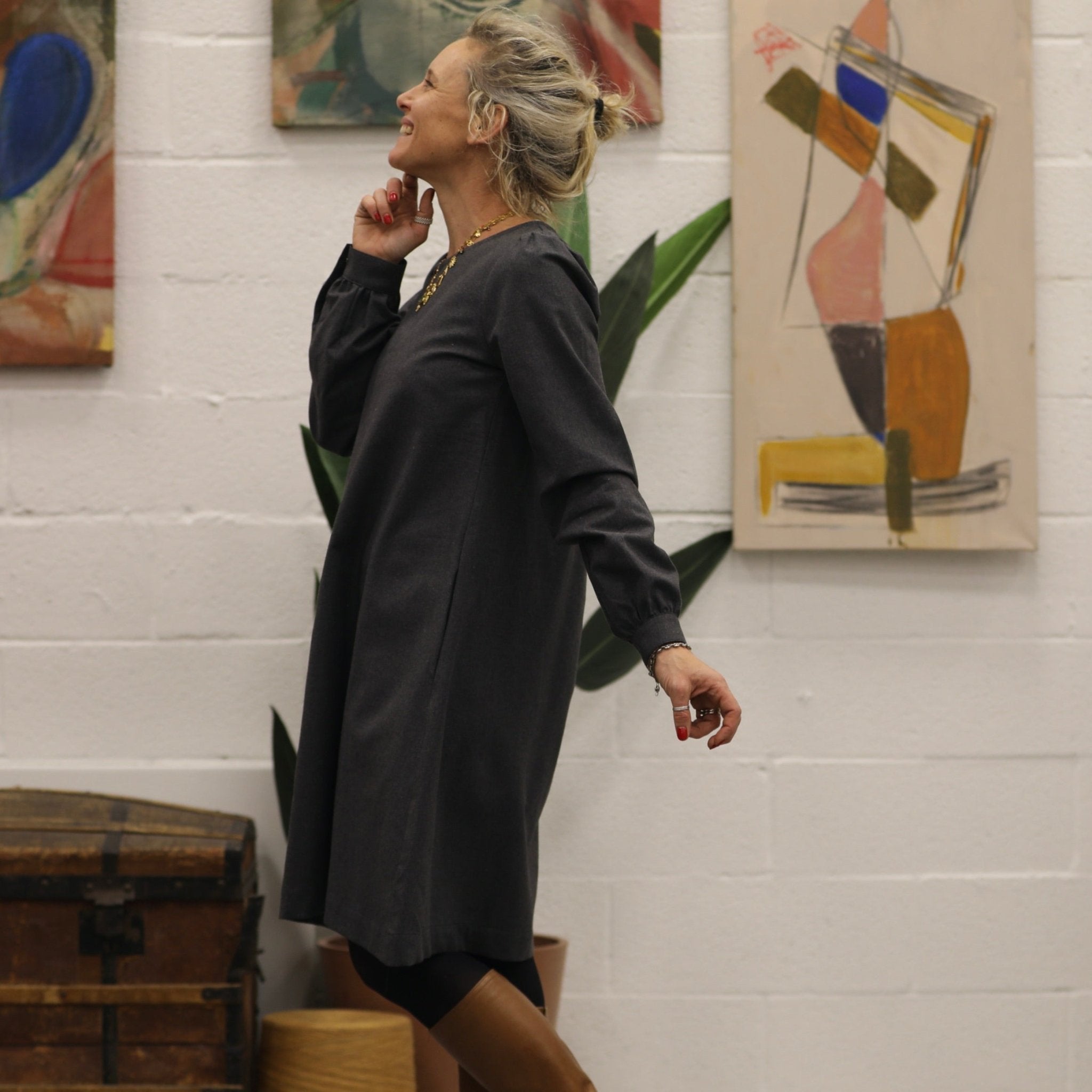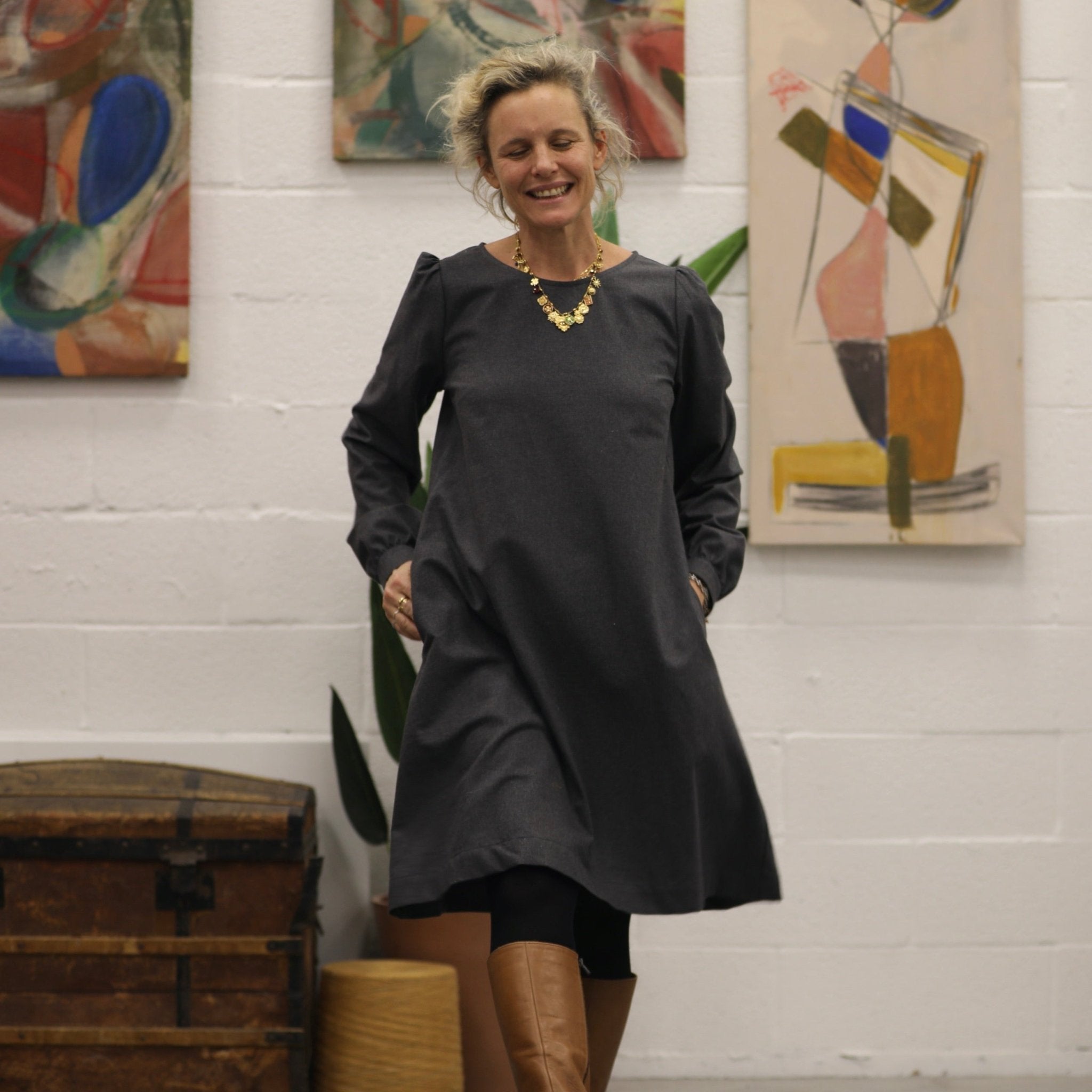 Rosine est une robe au col rond, délicatement ornée de petits plis aux épaules, créant des manches amples resserrées aux poignets par des bracelets boutonnés.