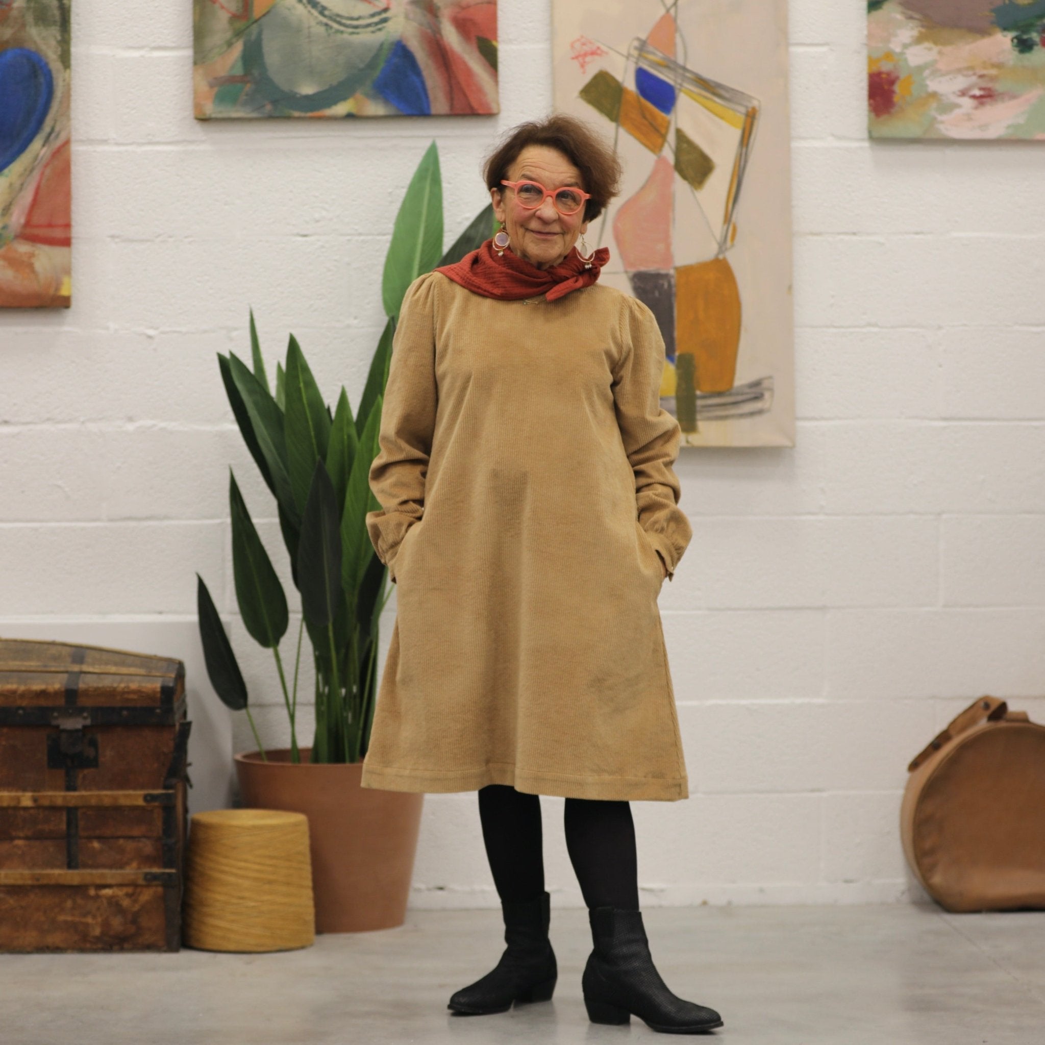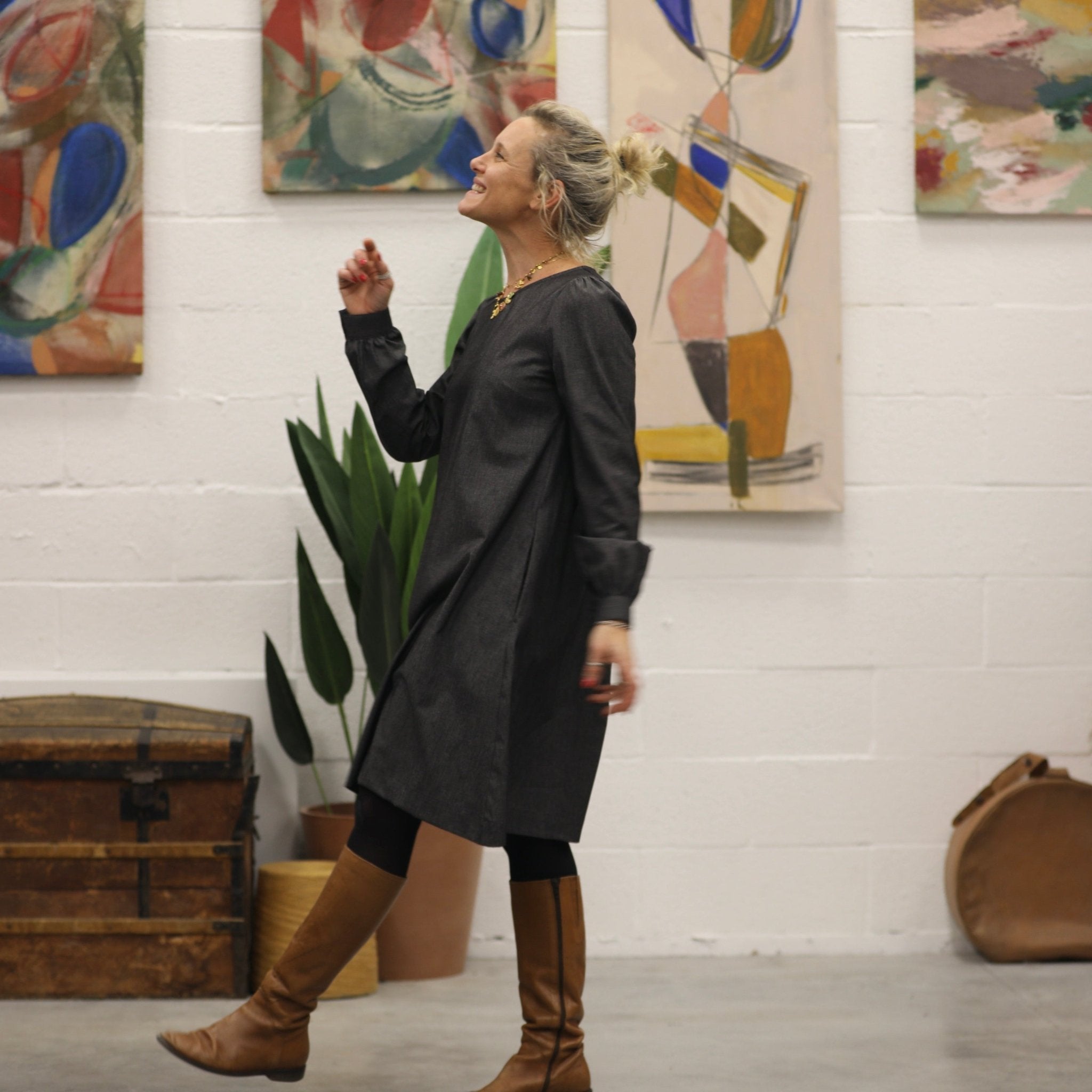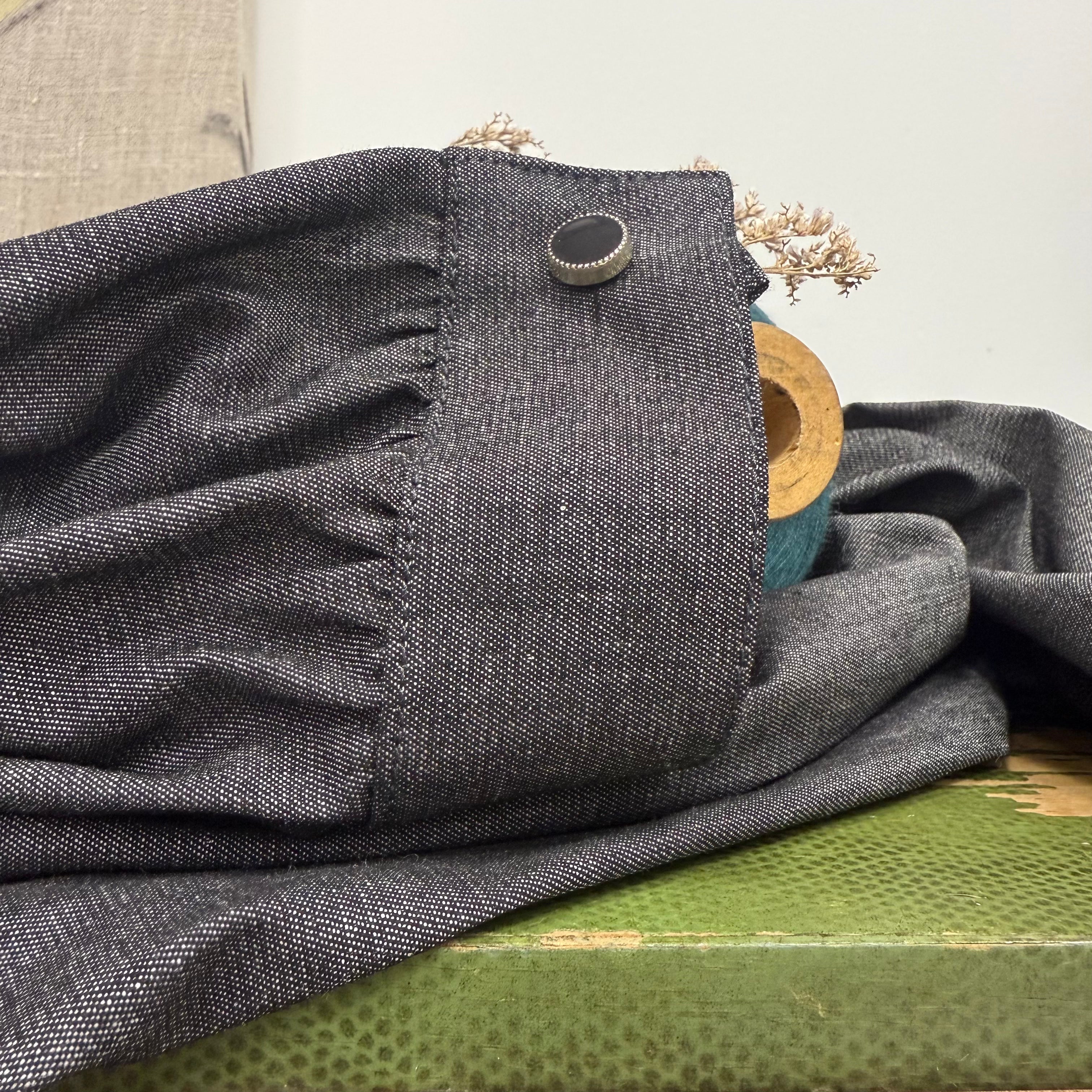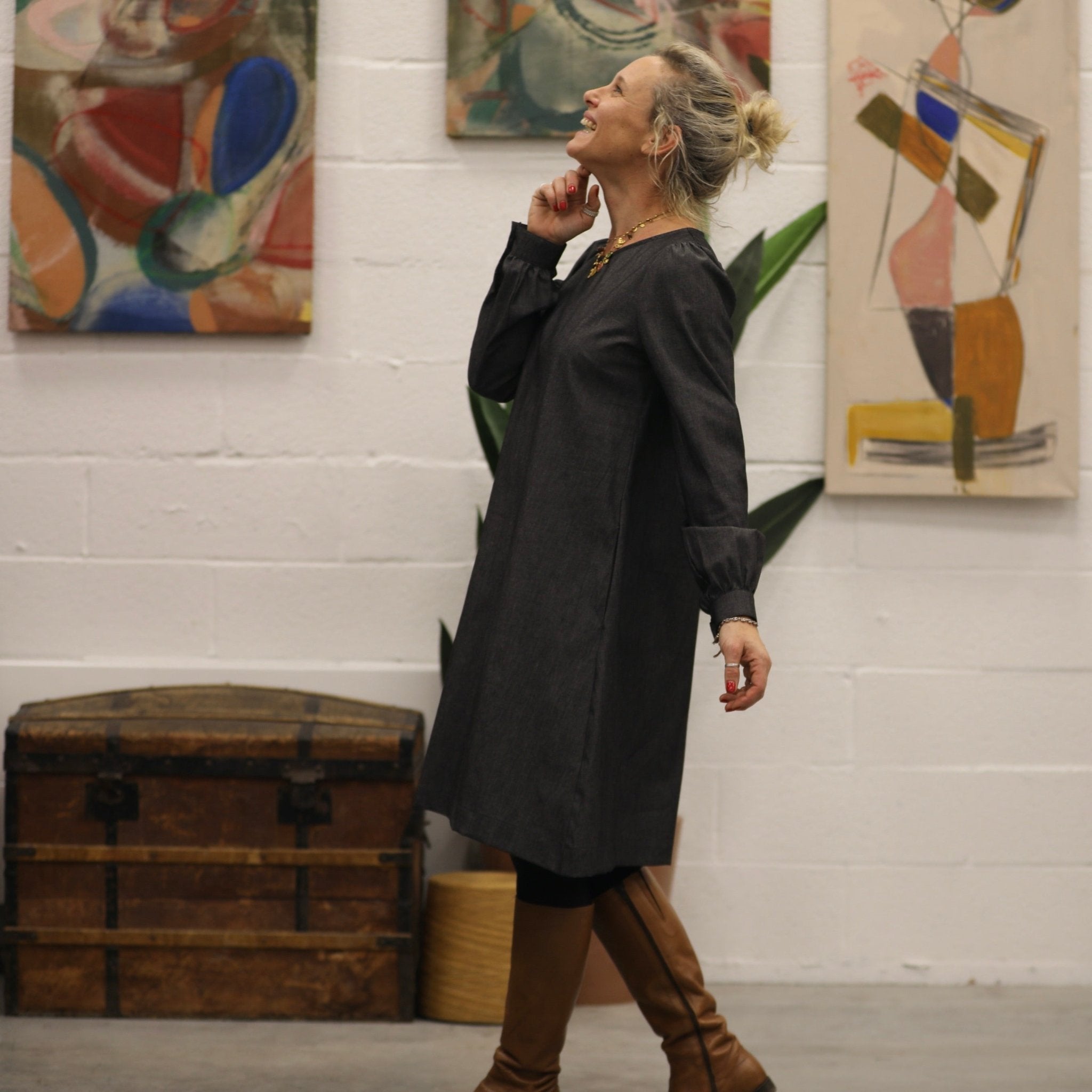 Rosine est une robe au col rond, délicatement ornée de petits plis aux épaules, créant des manches amples resserrées aux poignets par des bracelets boutonnés.