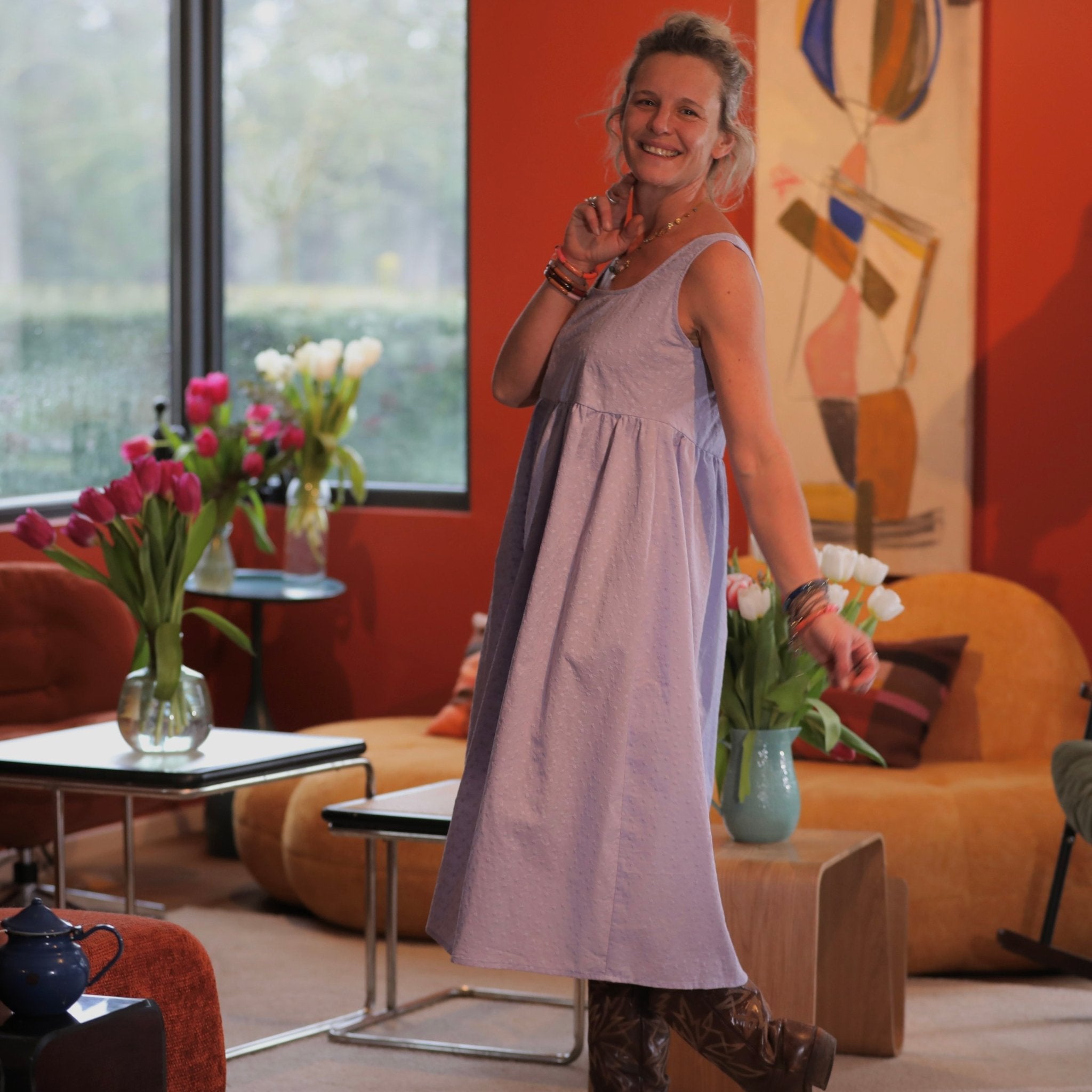 La robe Solène se porte facilement seule dès les beaux jours, avec des sandales ou des baskets pour un look décontracté chic. Pour une silhouette plus habillée, elle s’associe parfaitement au petit boléro Ange, qui vient structurer l’ensemble tout en légèreté.