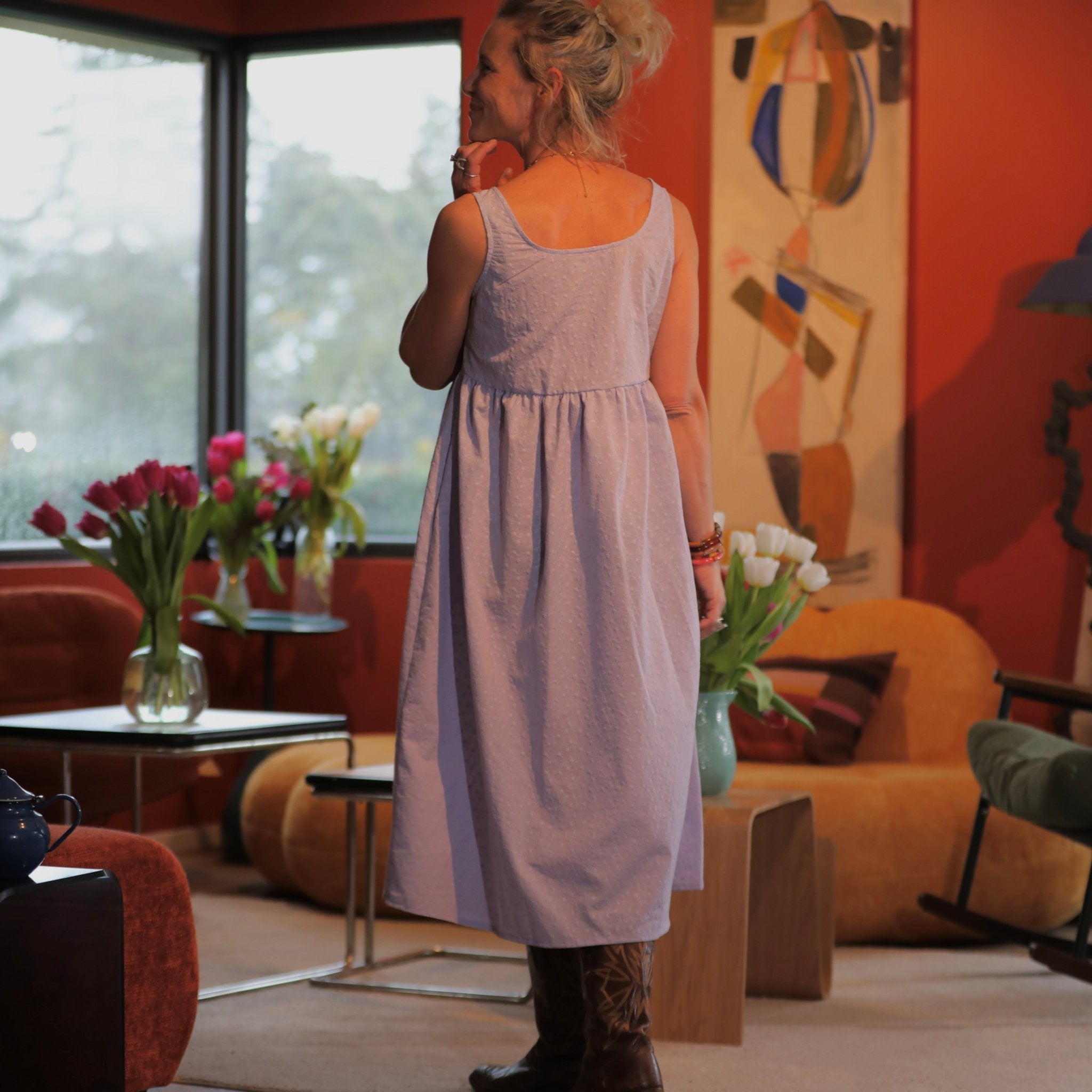 La robe Solène adopte une coupe taille marquée avec jupe froncée, qui met joliment en valeur la silhouette tout en laissant une grande liberté de mouvement. Son col rectangulaire délicatement arrondi, associé à de bretelles larges, dessine un décolleté au charme subtilement rétro, féminin et très doux.