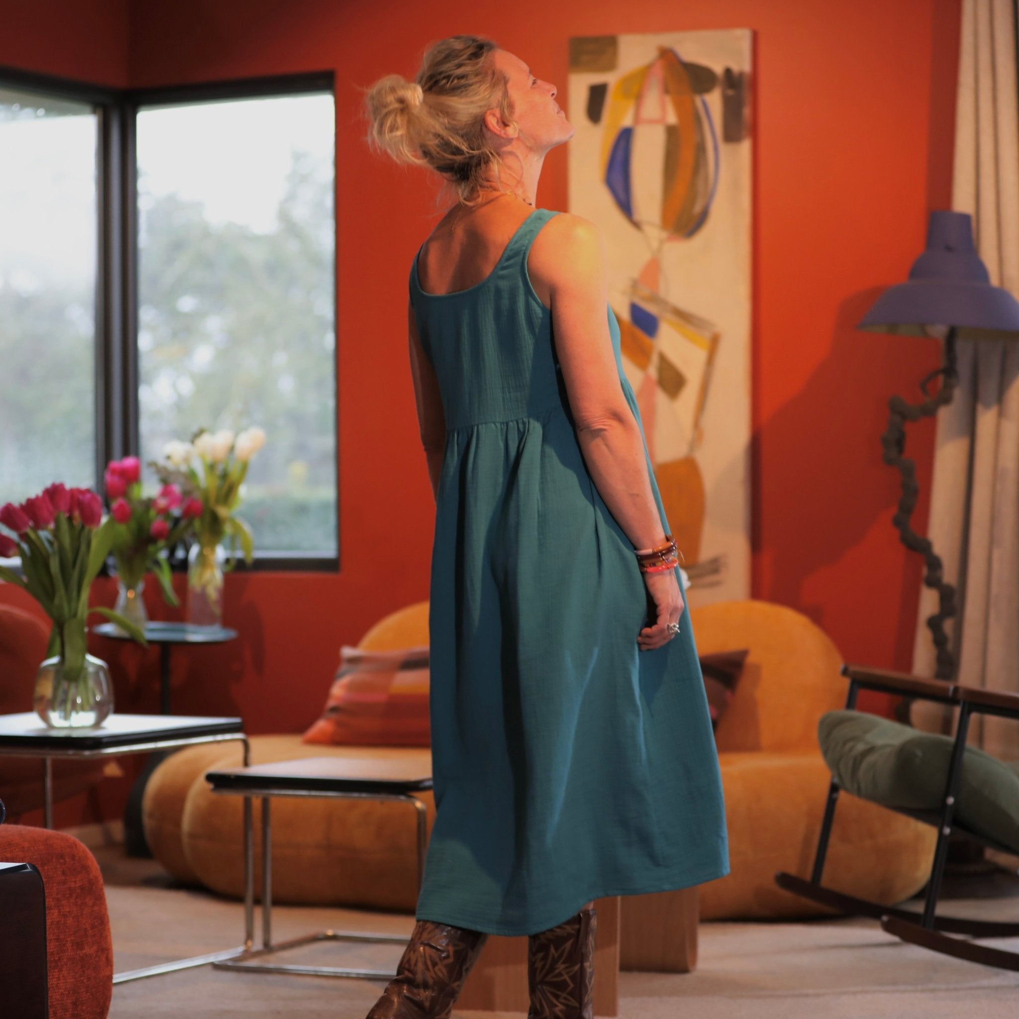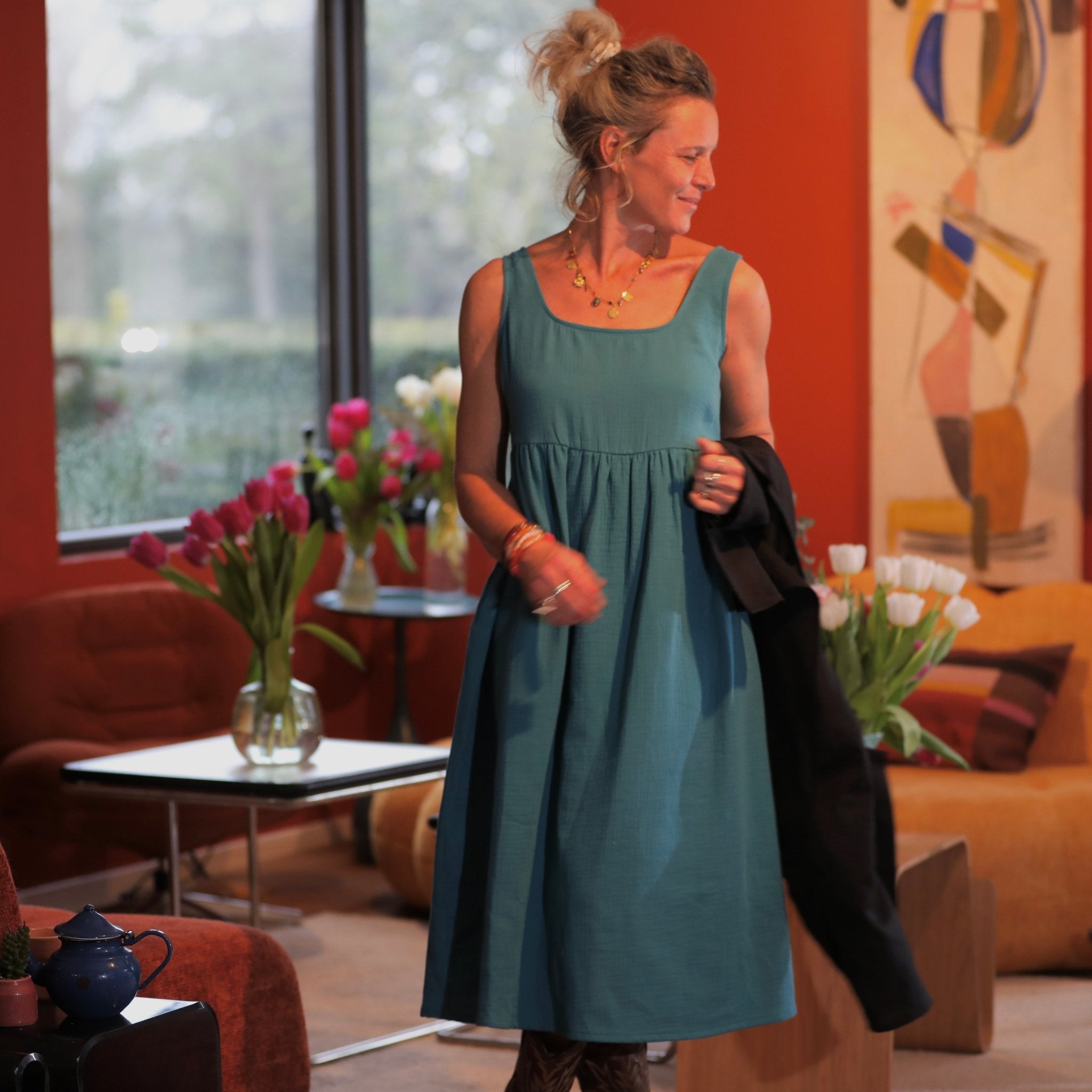 La robe Solène adopte une coupe taille marquée avec jupe froncée, qui structure la silhouette tout en conservant une grande aisance au porté. Son col rectangulaire subtilement arrondi, associé à de bretelles larges, dessine un décolleté au charme légèrement rétro, féminin et très doux.