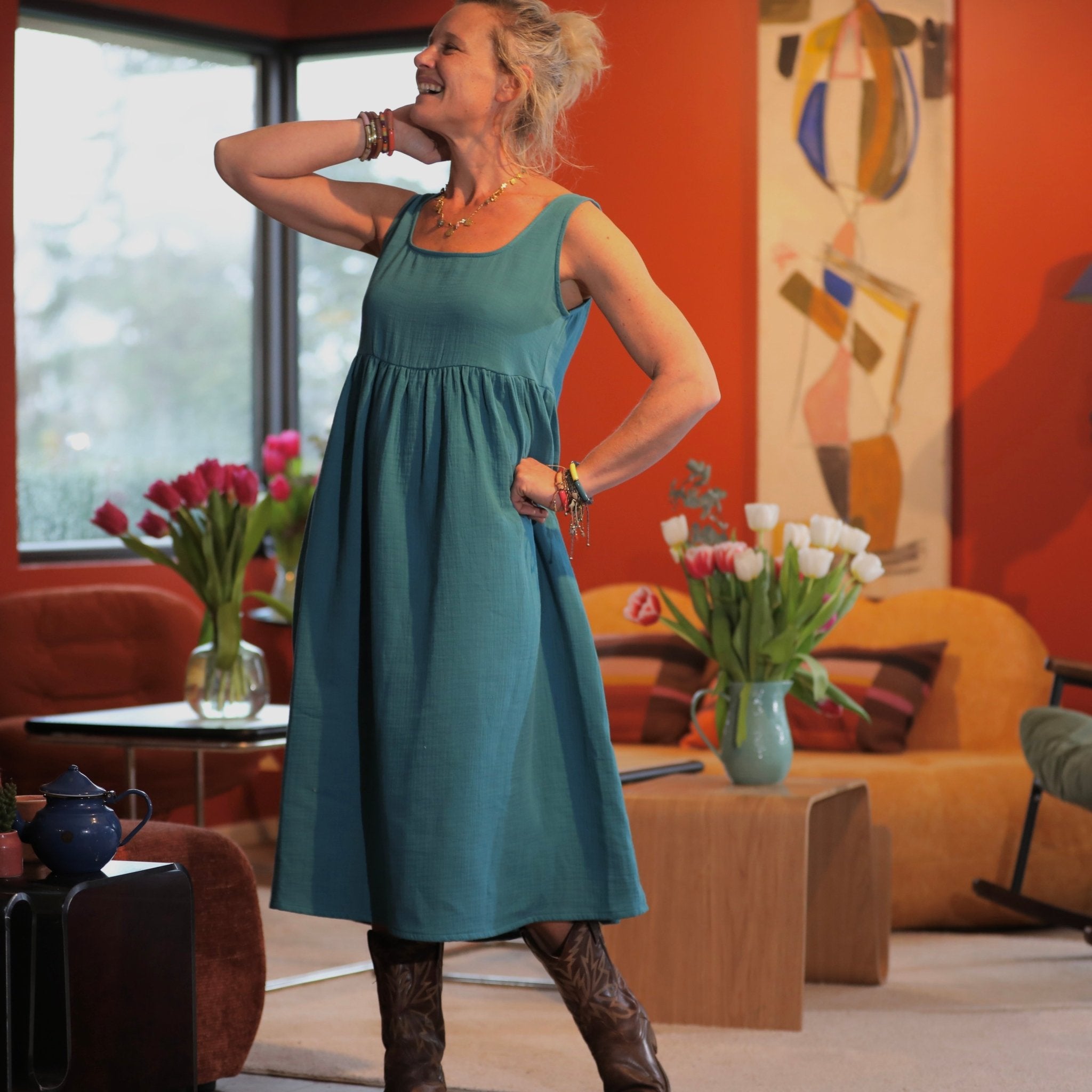 Confectionnée dans une double gaze de coton coloris canard très douce, légère et respirante, cette robe offre un tombé souple et naturel. La double gaze apporte un toucher gaufré délicat, une grande sensation de confort et une belle profondeur de couleur, idéale pour un porté facile et agréable.