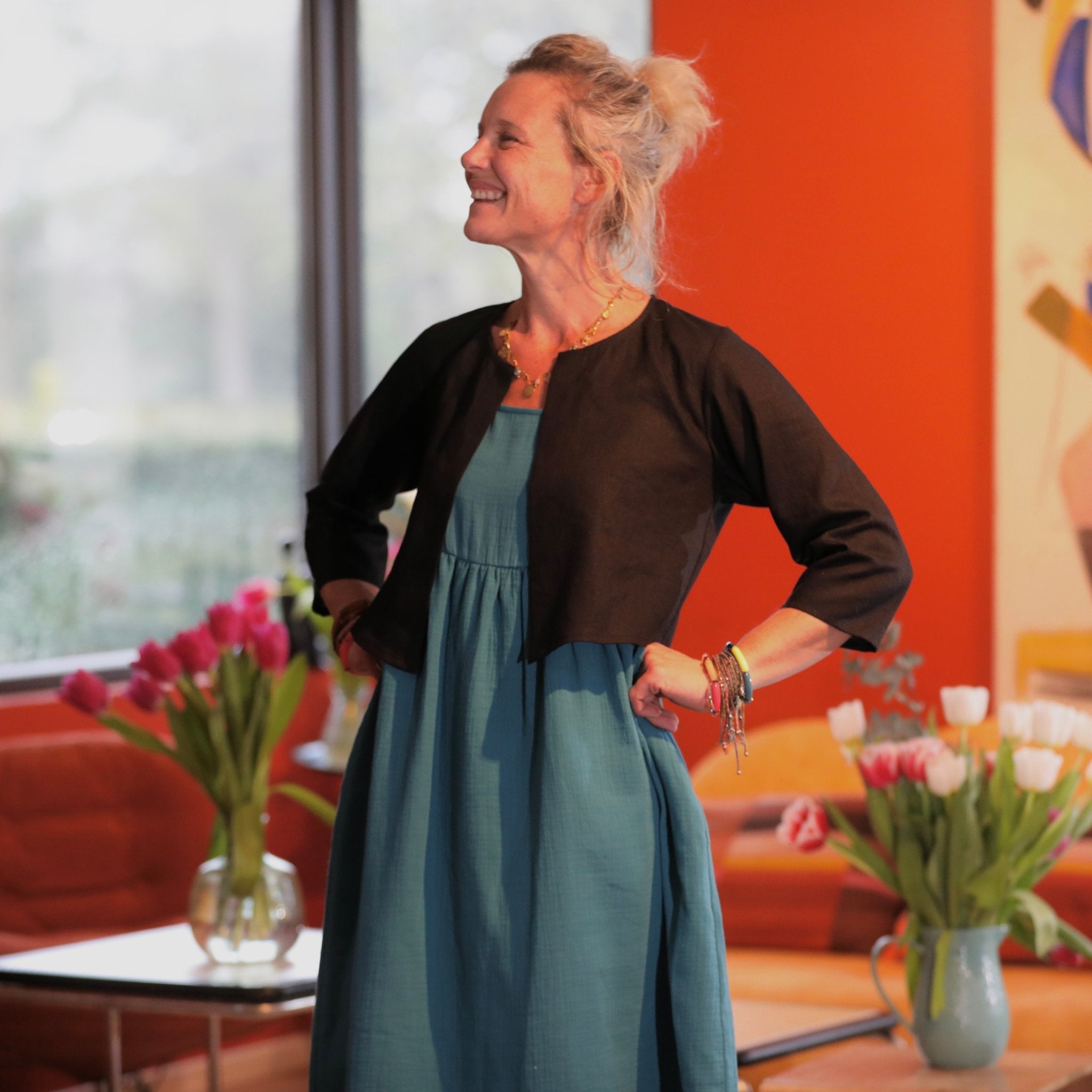 La robe Solène se porte seule dès les beaux jours, avec des sandales, des baskets ou des espadrilles pour un look décontracté chic. Pour une silhouette plus habillée, elle se marie parfaitement avec le petit boléro Ange, qui vient structurer l’ensemble tout en douceur.