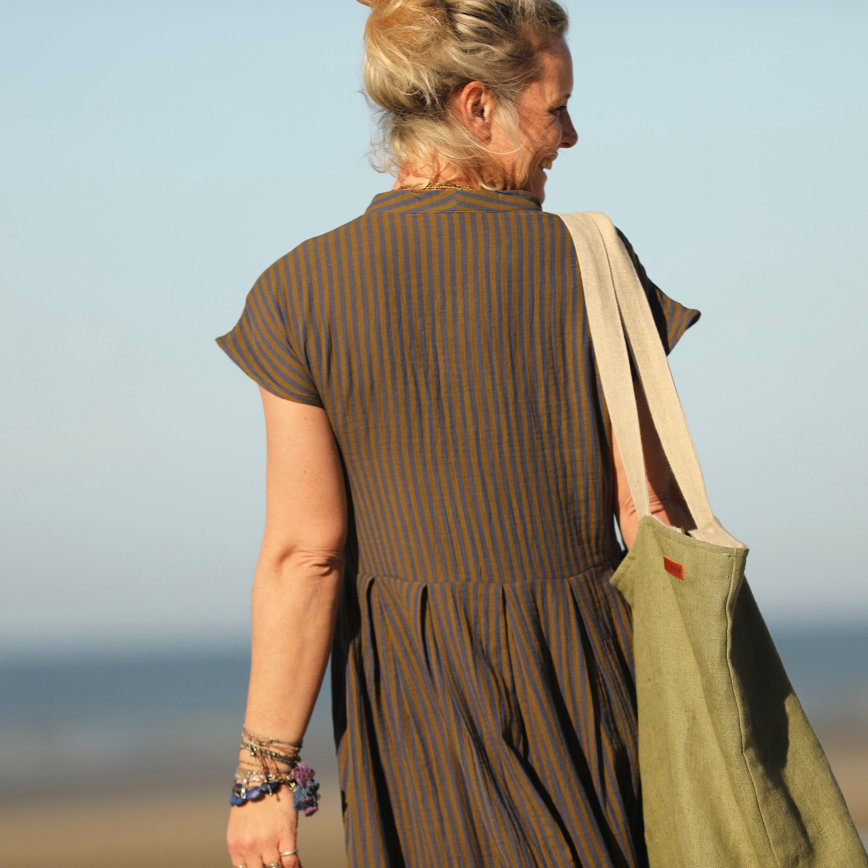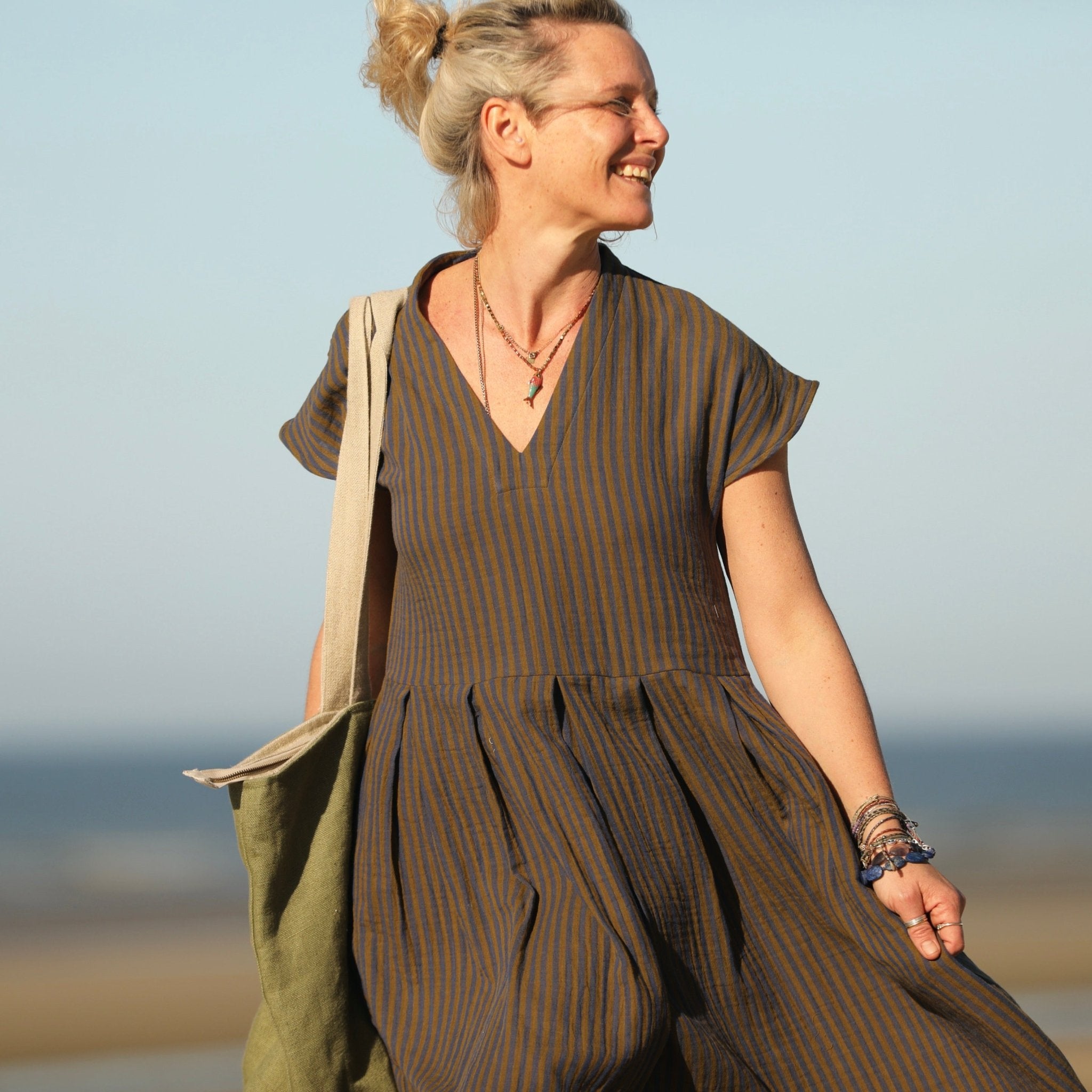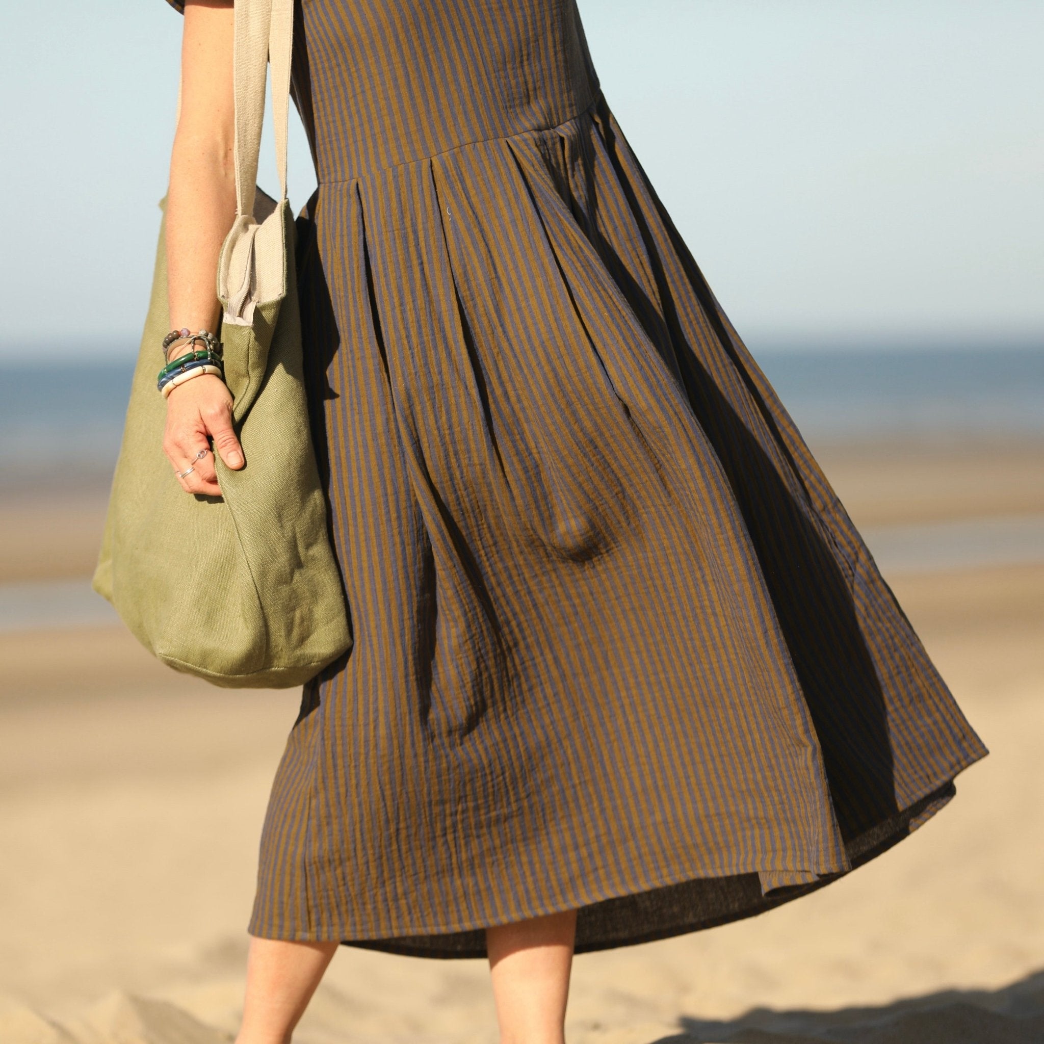 Robe Sylvette - double gaze de coton rayée kaki/marine