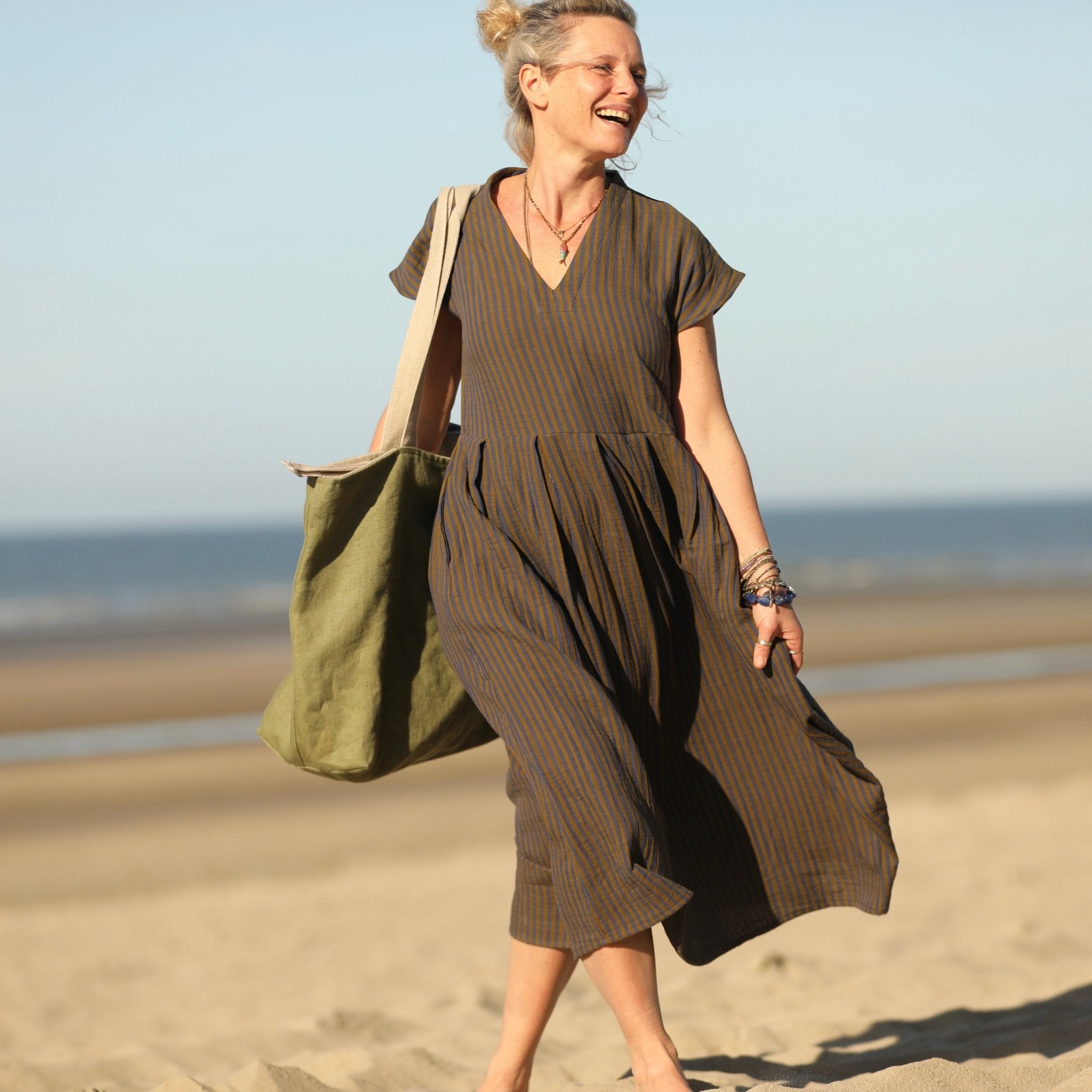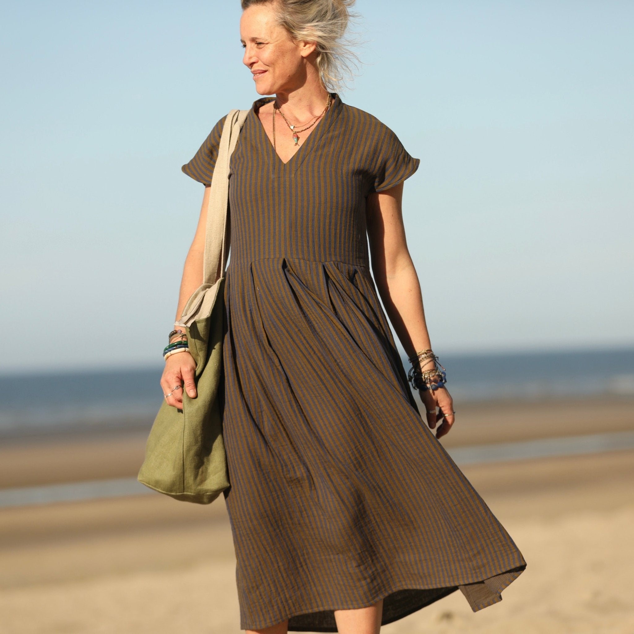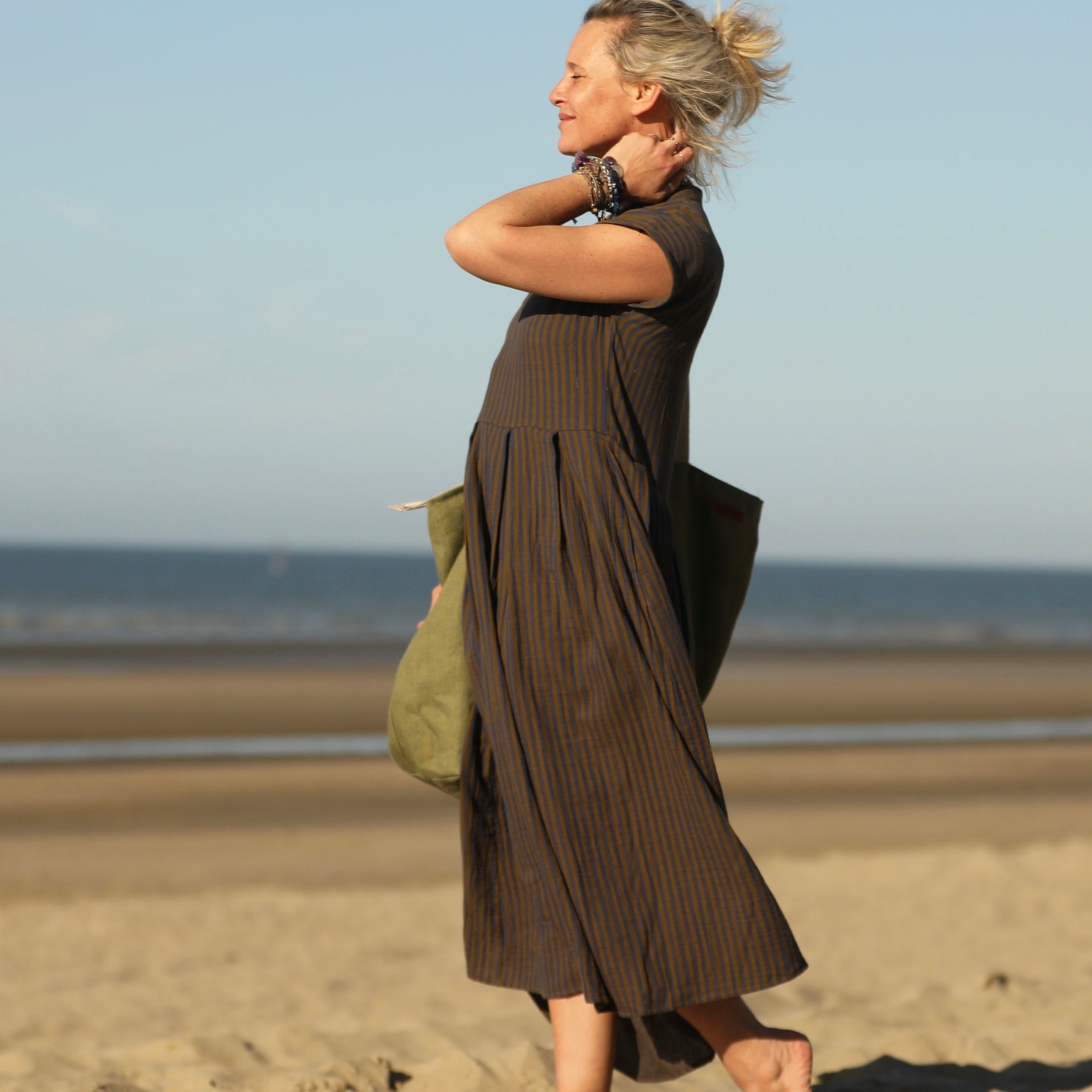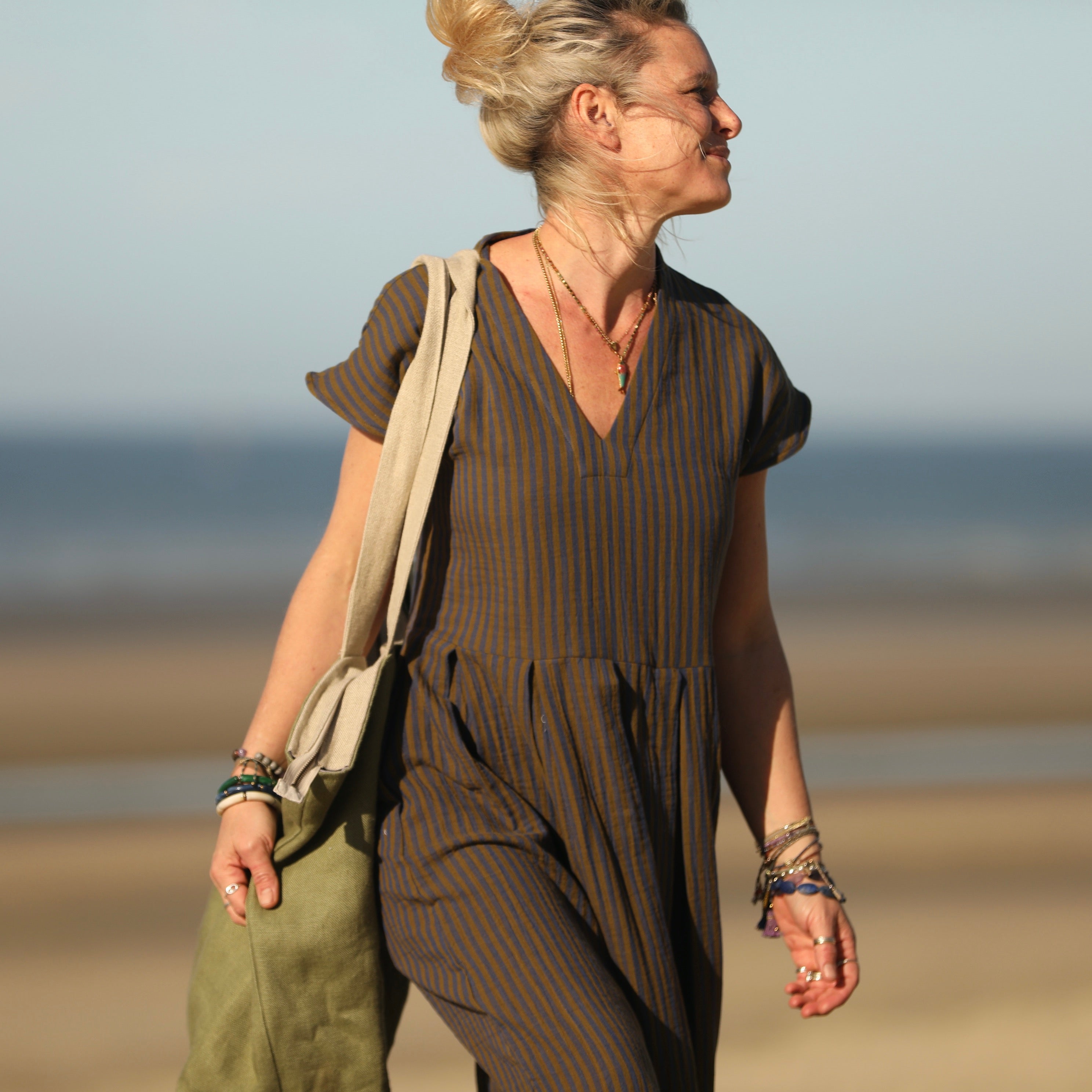 Robe Sylvette - double gaze de coton rayée kaki/marine