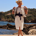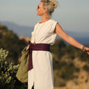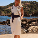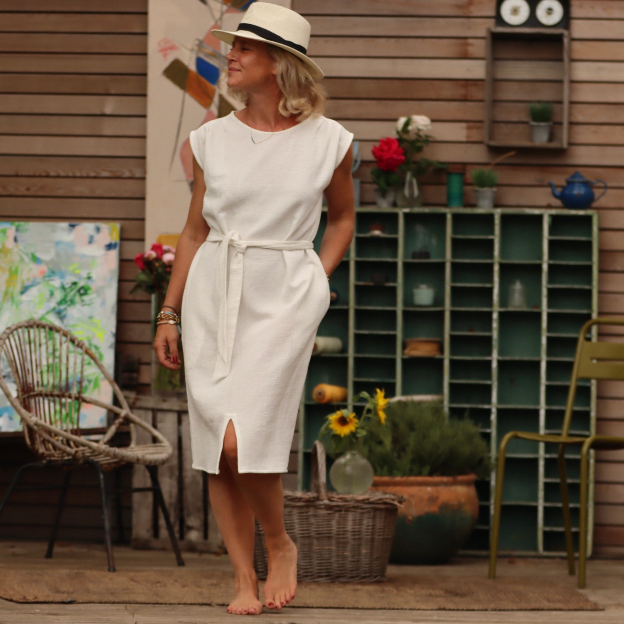 Découvrez Tia, une robe rétro charmante qui allie un décolleté rond flatteur, des plis élégants au niveau des emmanchures et des fentes délicates à l'avant et à l'arrière. Dotée de deux poches discrètes sur les côtés, Tia présente une coupe droite légèrement évasée, offrant une ampleur confortable.