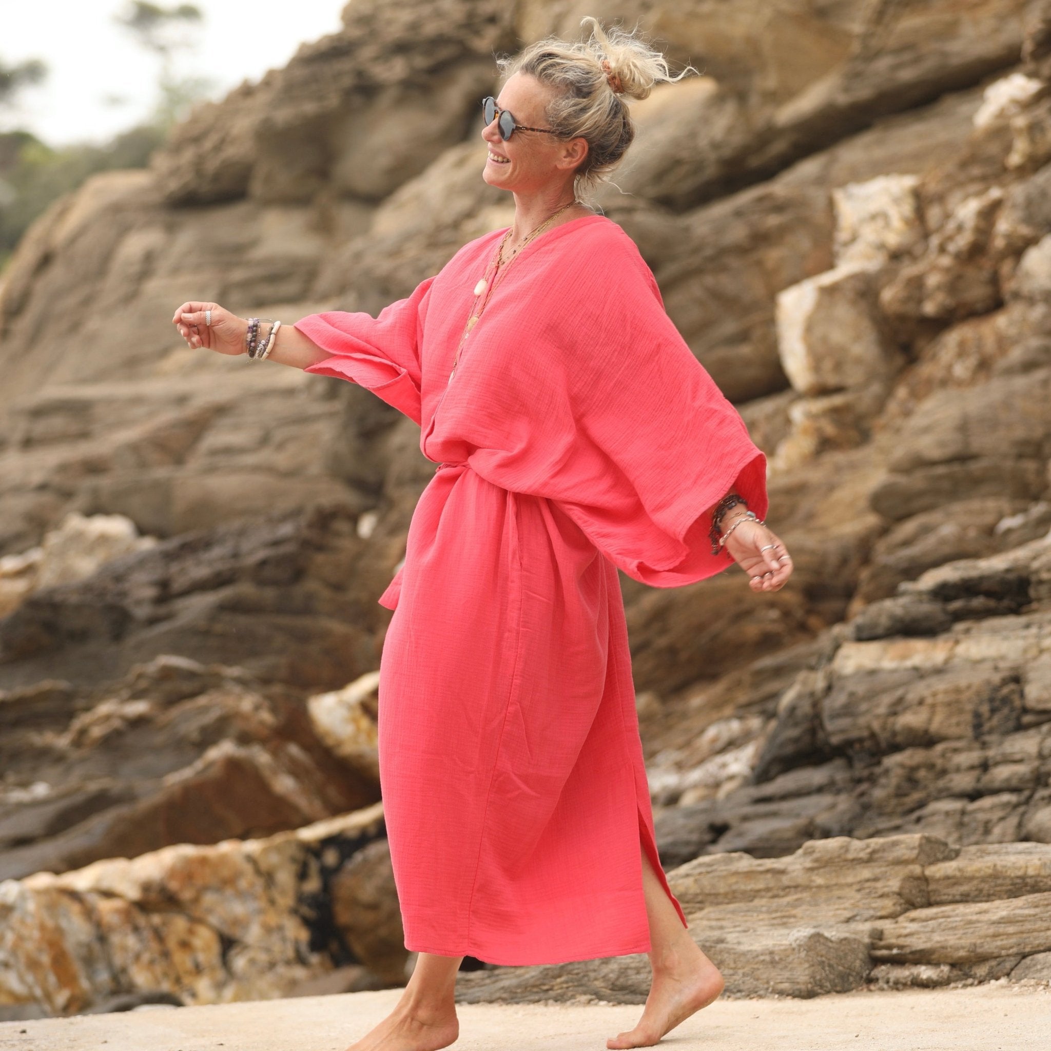 Cette robe versatile convient à toutes les statures, du XS au XXL, assurant confort et style avec plus ou moins d'ampleur.