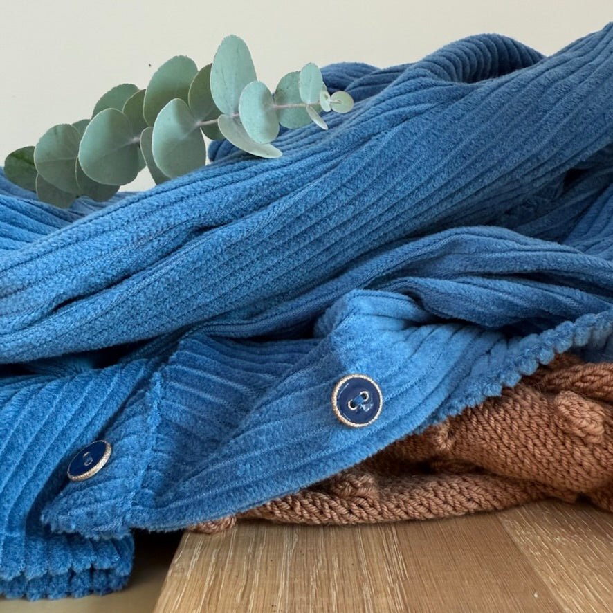100 % coton – velours cotelé navy, une matière douce, souple avec un tombé lourd et chaud.