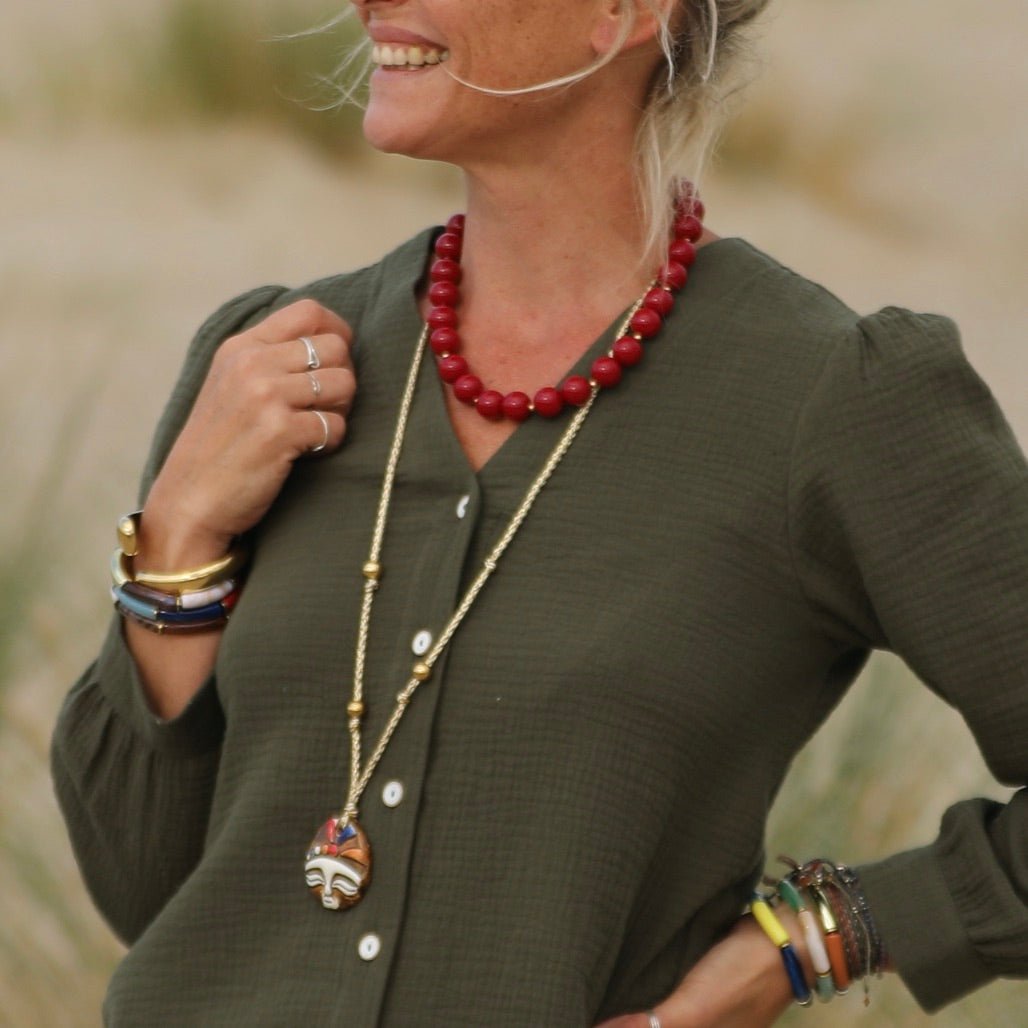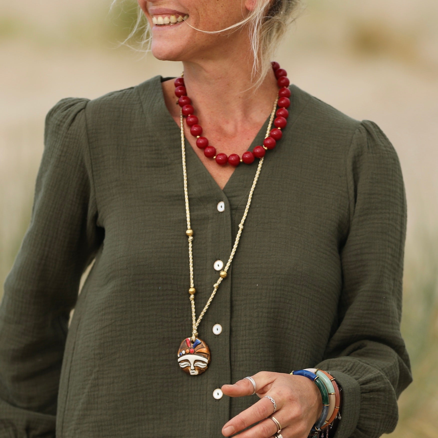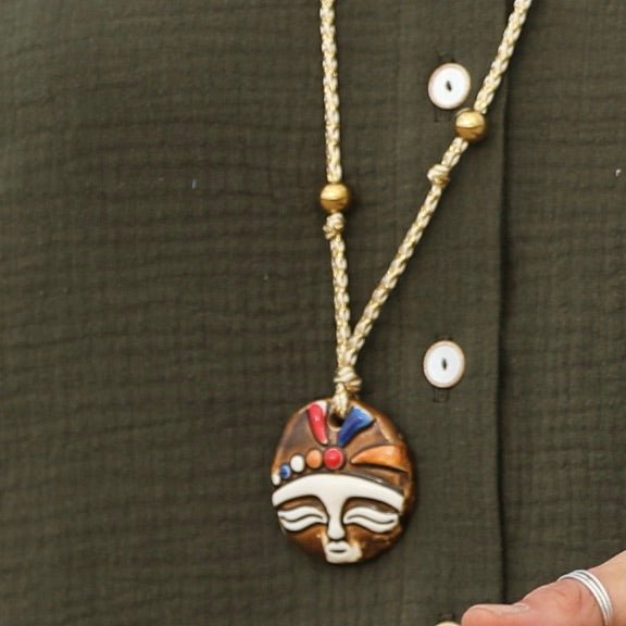 Le sautoir Oraison se distingue par son pendentif sculptural en forme de visage, travaillé en pierre émaillée aux nuances chaleureuses.
