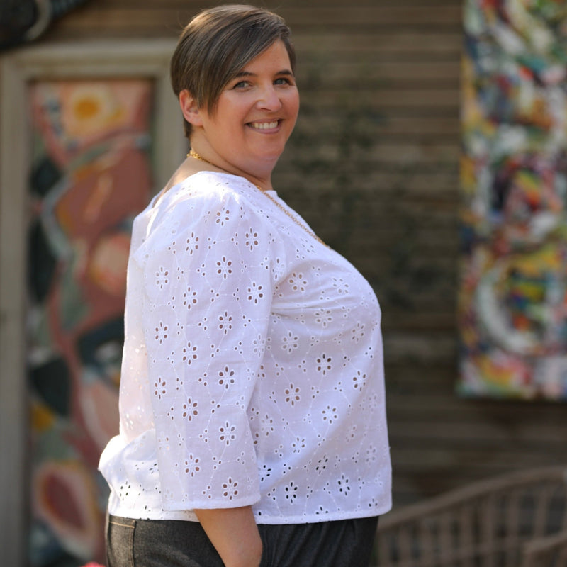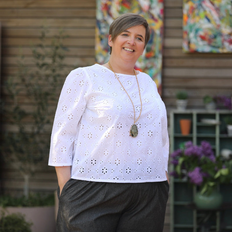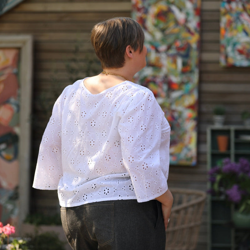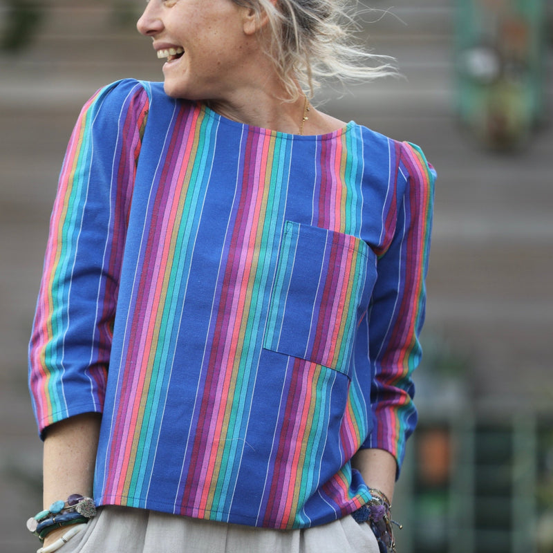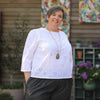 Toscane, une blouse élégante au col rond délicatement décolleté, dotée de manches 3/4 et d'une large poche plaquée sur la poitrine.