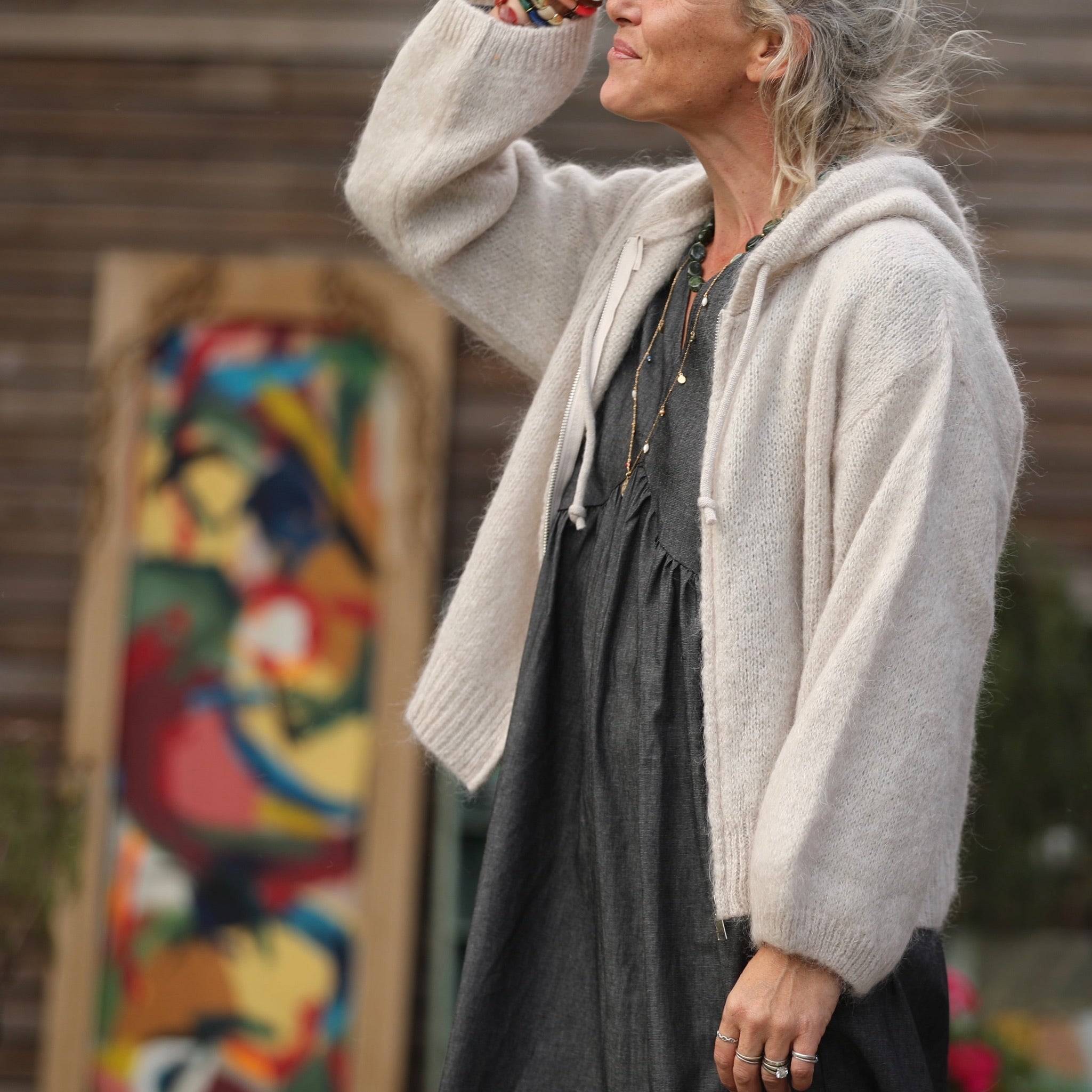 Dans cette version maille ficelle, Tulia séduit par son coloris doux et naturel, facile à associer et lumineux en toute saison. Le zip ton sur ton et la capuche souple apportent une touche décontractée et élégante. Son dos légèrement prolongé souligne une silhouette fluide, tandis que la maille extensible assure confort et liberté de mouvement.