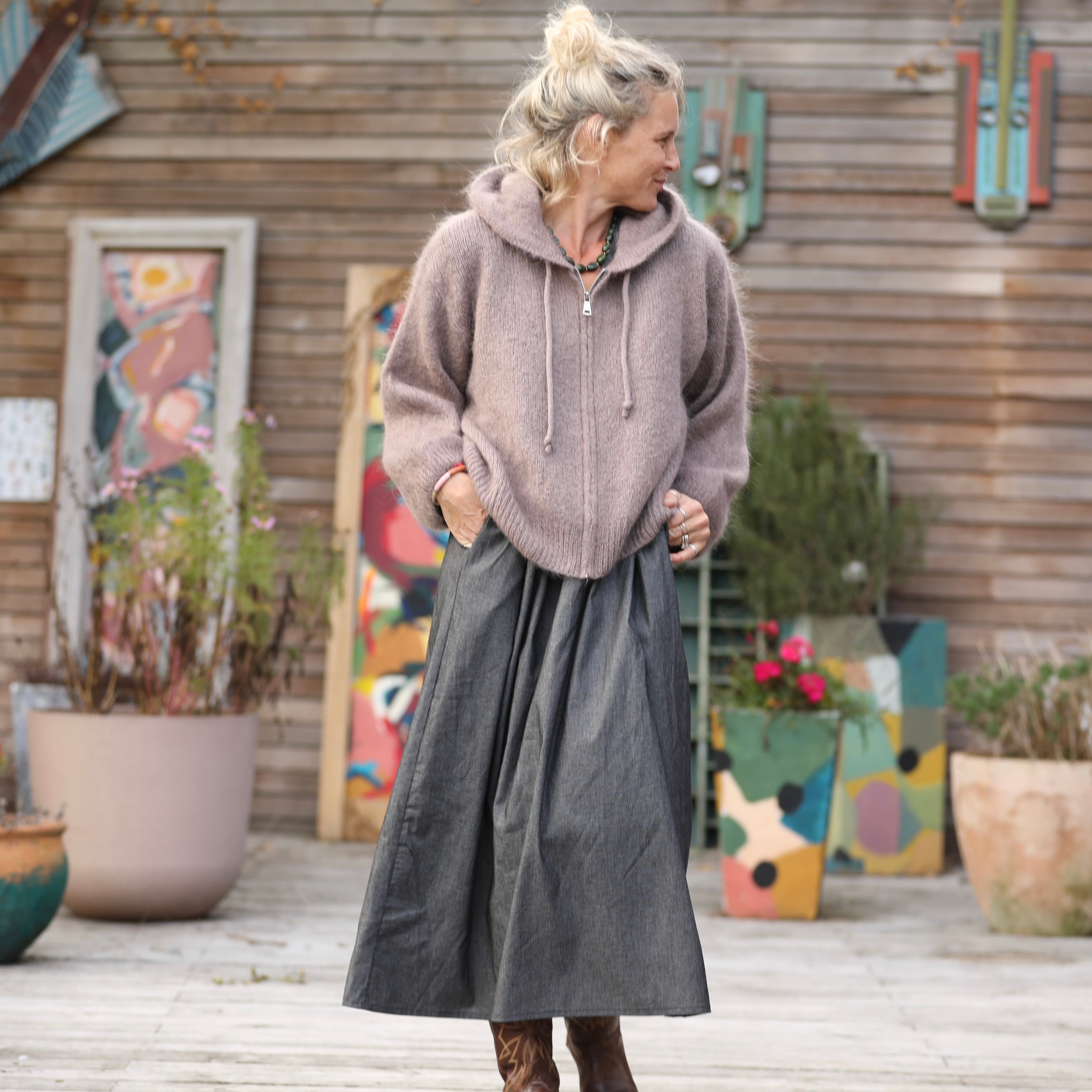 Dans cette version maille moka, Tulia séduit par sa teinte chaude et profonde, à la fois élégante et intemporelle. Le zip ton sur ton et la capuche souple apportent une touche de modernité, tandis que la coupe fluide et légèrement prolongée au dos souligne la silhouette avec naturel. Parfait pour réchauffer une tenue tout en restant chic.